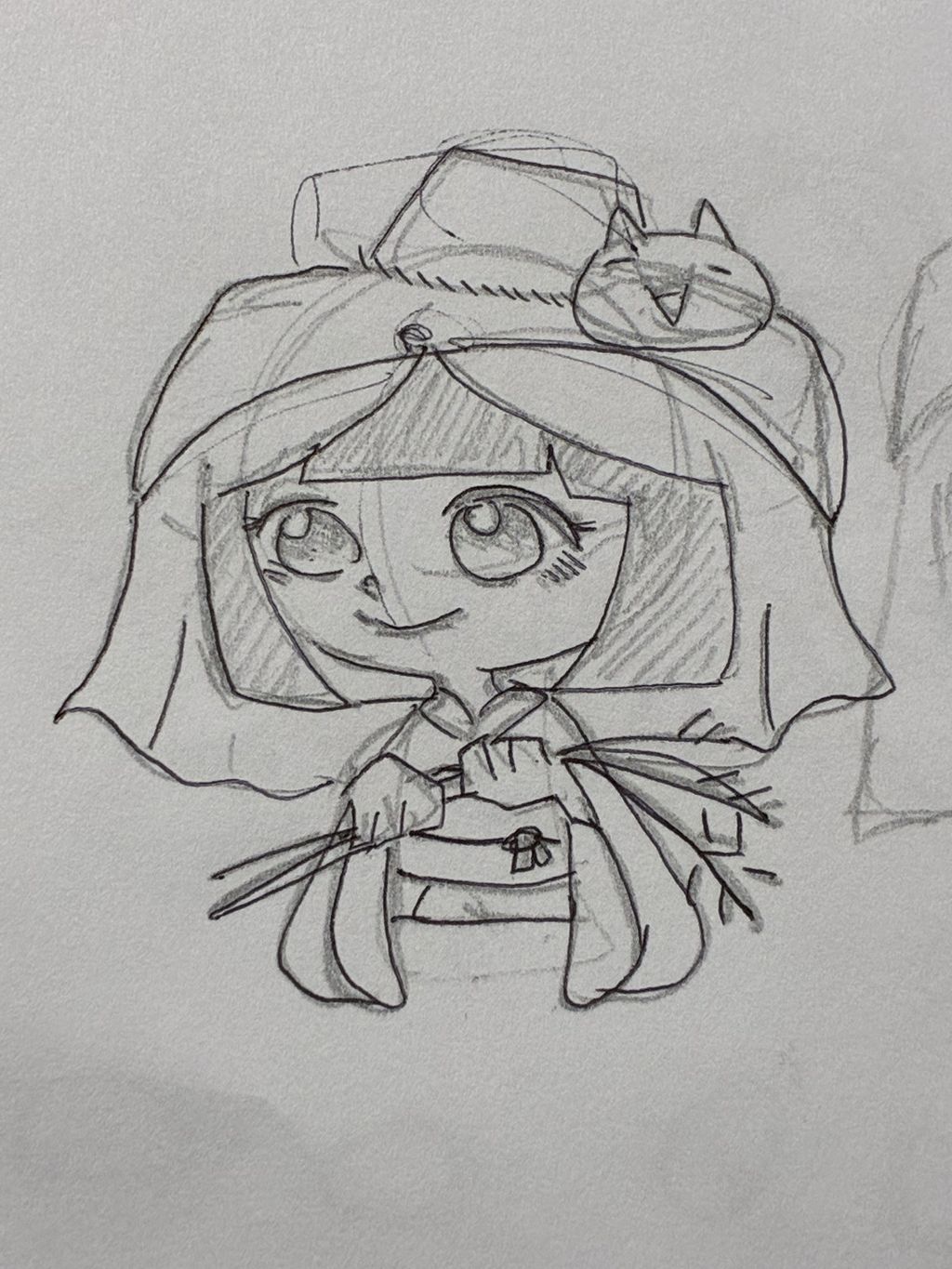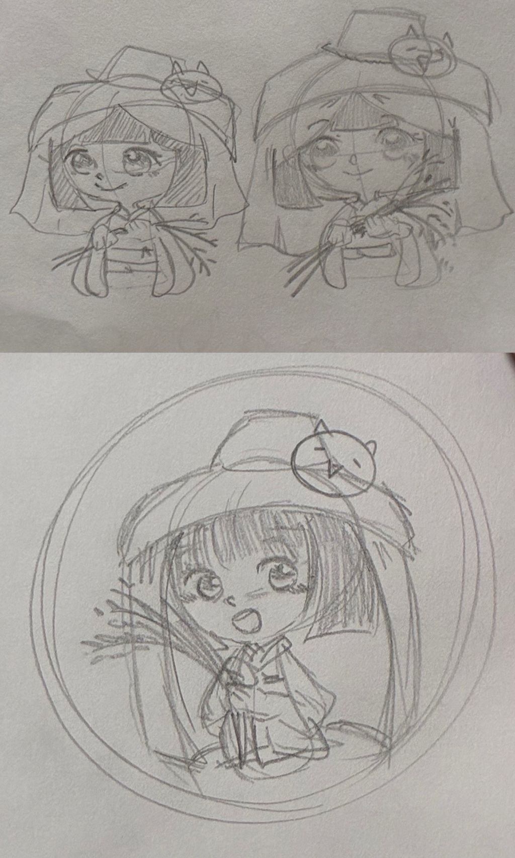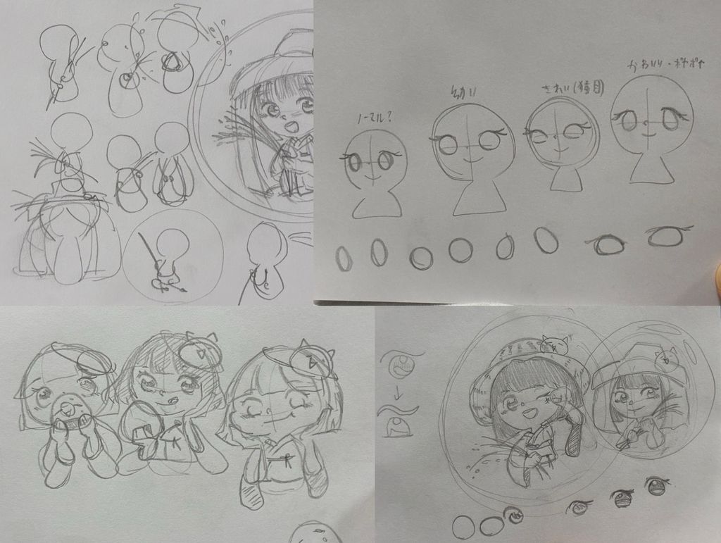 初期ラフ案にある通り”オニギリ”を持たせたり、頬ぼったり、稲穂を携えたり、市女笠をかぶせたり。眼の位置や形、座らせてたり、頬杖つかせたり。。。