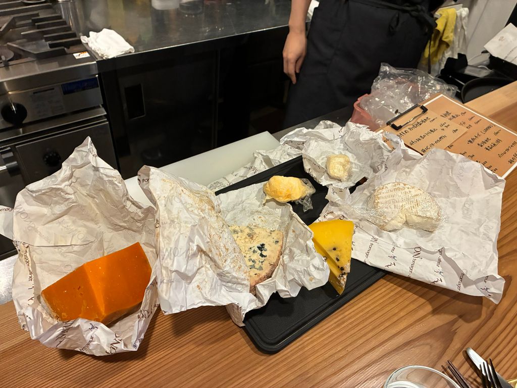 チーズをじっくりと楽しむことに!店主さんにお願いをして、チーズを並べてもらいました!まずは、左から「ミモレット18カ月」、ブルーチーズの「1924 ミル・ヌフソン」、サフランと黒胡椒のチーズ「ピアチェンティーヌ」、ウォッシュチーズの「ラングル」、シェーブルチーズの「クロタン・ド・シャヴィニョル」、そして水牛の白カビチーズ「ロビオラ・ディ・ブーファラ」です!この中から私が選んだのは・・・
