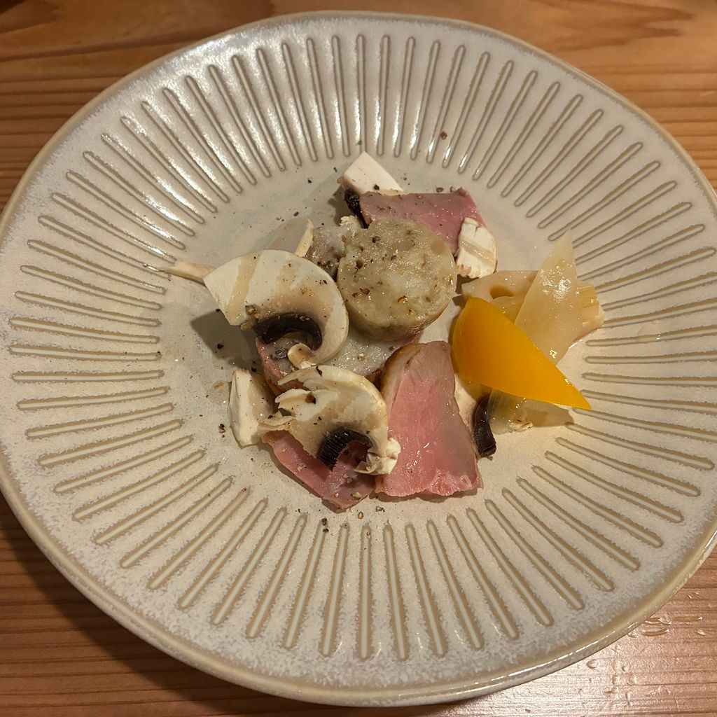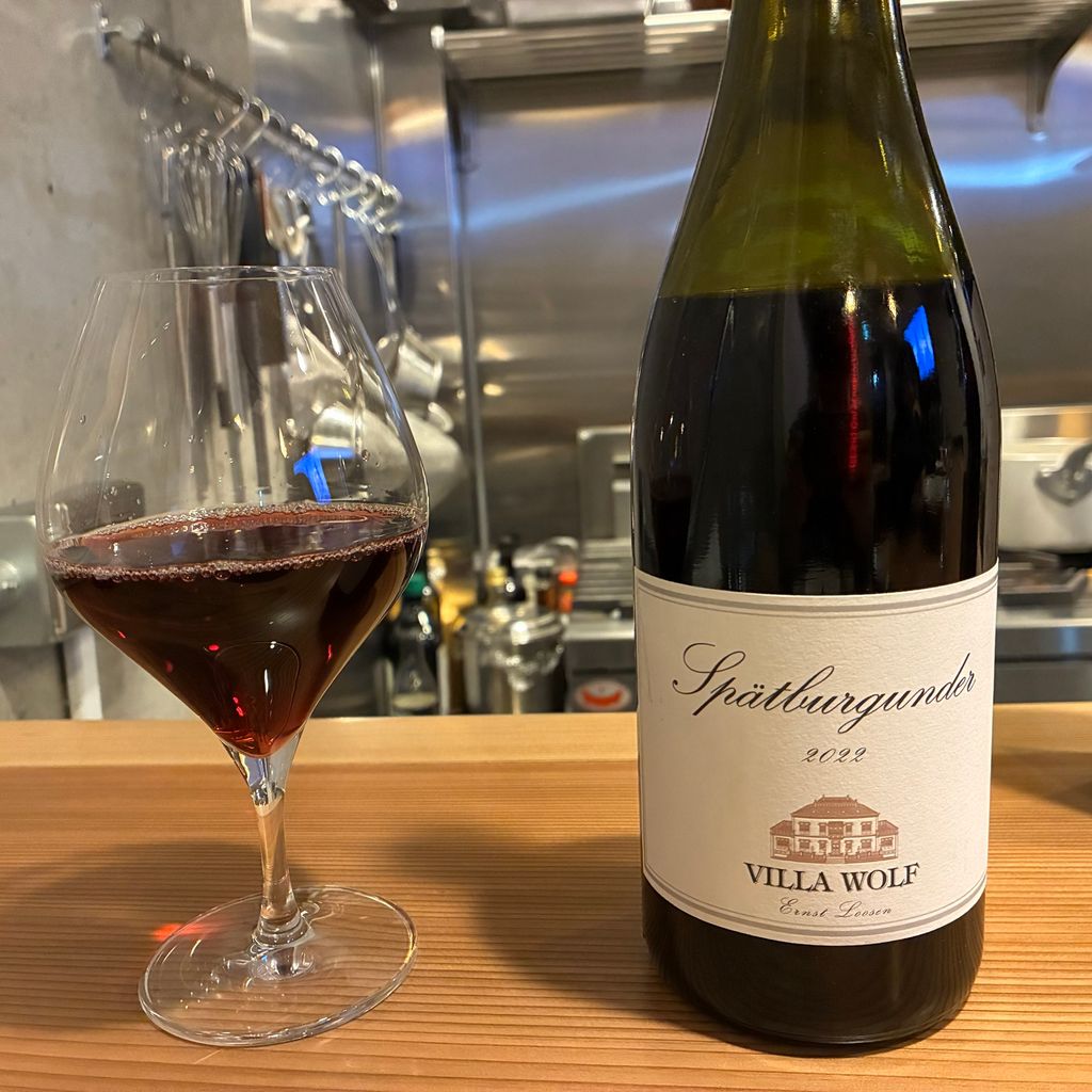 このタイミングで赤ワインもオーダー!ドイツの「ヴィラ・ヴォルフ シュペートブルグンダー 2022」、シュペートブルグンダー(=ピノ・ノワール)を使った赤ワインで、クリーミーな白カビチーズとも好相性でした!そして、今度はこのワインに合わせて・・・