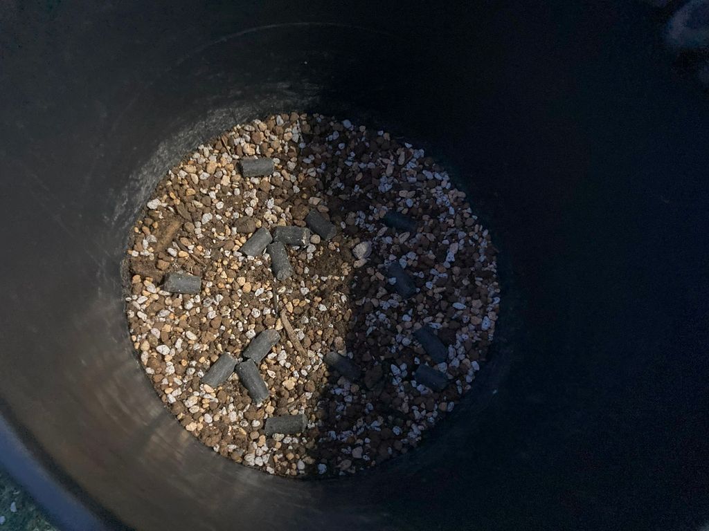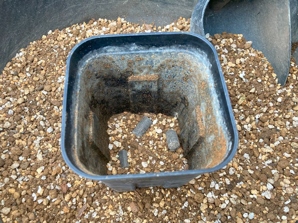 鉢底石を置いて、その上から土と油かすを入れます。あとは・・・
