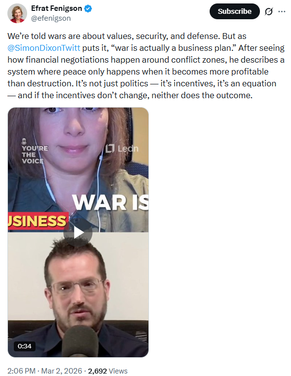 戦争は価値観や安全保障、防衛のためだと私たちは教えられてきました。 しかし、@SimonDixonTwitt が言うように「戦争とは実際にはビジネスプラン」です。