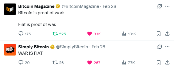 今日は、英語圏のXで見かけた「戦争とビットコイン」「反戦」のミーム画像やポストをご紹介します。