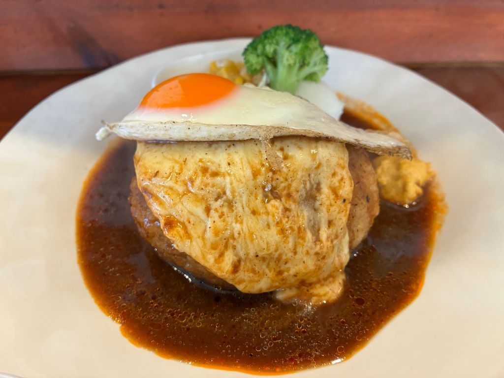 ついに念願のハンバーグとご対面(笑)!私が注文したのは、豚100%のオリジナルハンバーグにチーズをのせたものですが・・・