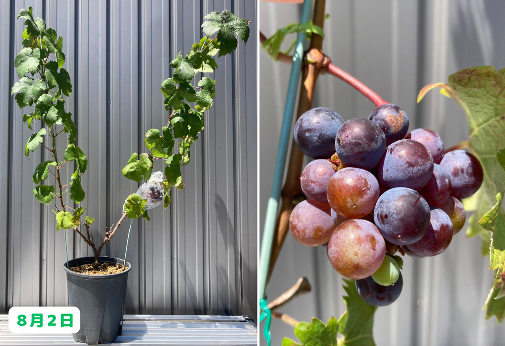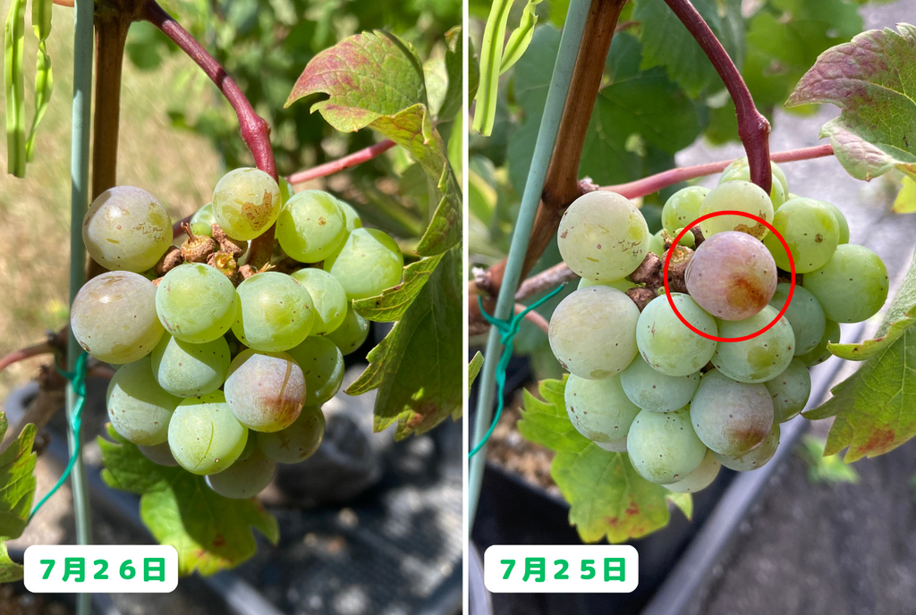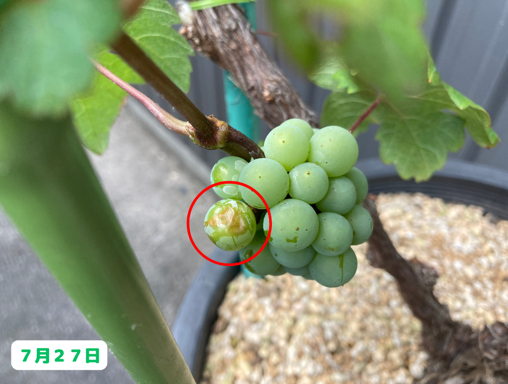 みなさんこんにちは。園芸素人の私がブドウ栽培に挑戦すると言うこの企画、前回はついにヴェレゾン(色付き)し始め、順調に成長を続けていた挿し木の先輩カベルネの実が、突如脱粒してしまうと言うアクシデントに見舞われました。・・・そして、何が起こっているのか原因がわからないまま迎えた翌日。真っ先に挿し木の先輩カベルネの様子を確認してみると・・・