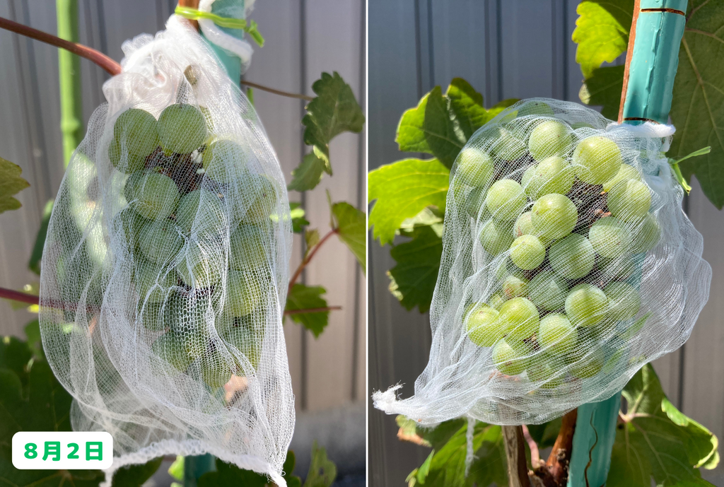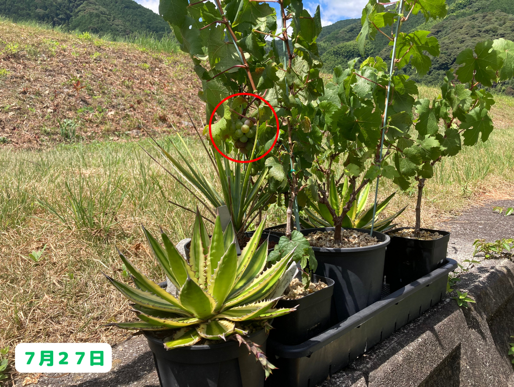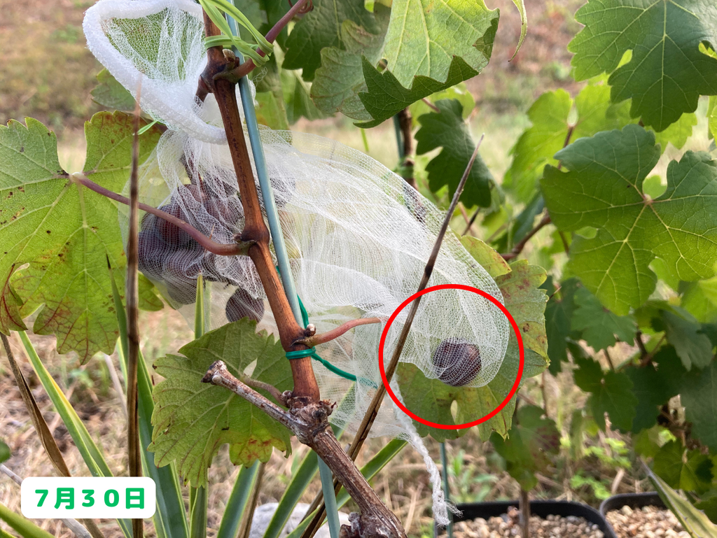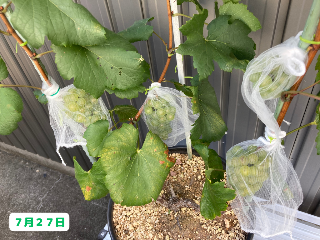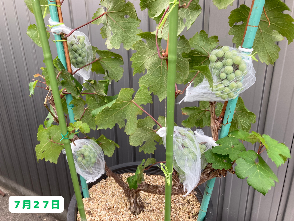 徐々に徐々に粒が取られた結果、初めの頃よりもやや小さくなってしまいました(笑)。・・・このまま、全ての実が取られてしまうんじゃないかと少し不安になってきましたが(笑)、それはさておき、ここで一度他のブドウ達の様子についても触れておきたいと思います。まずは・・・