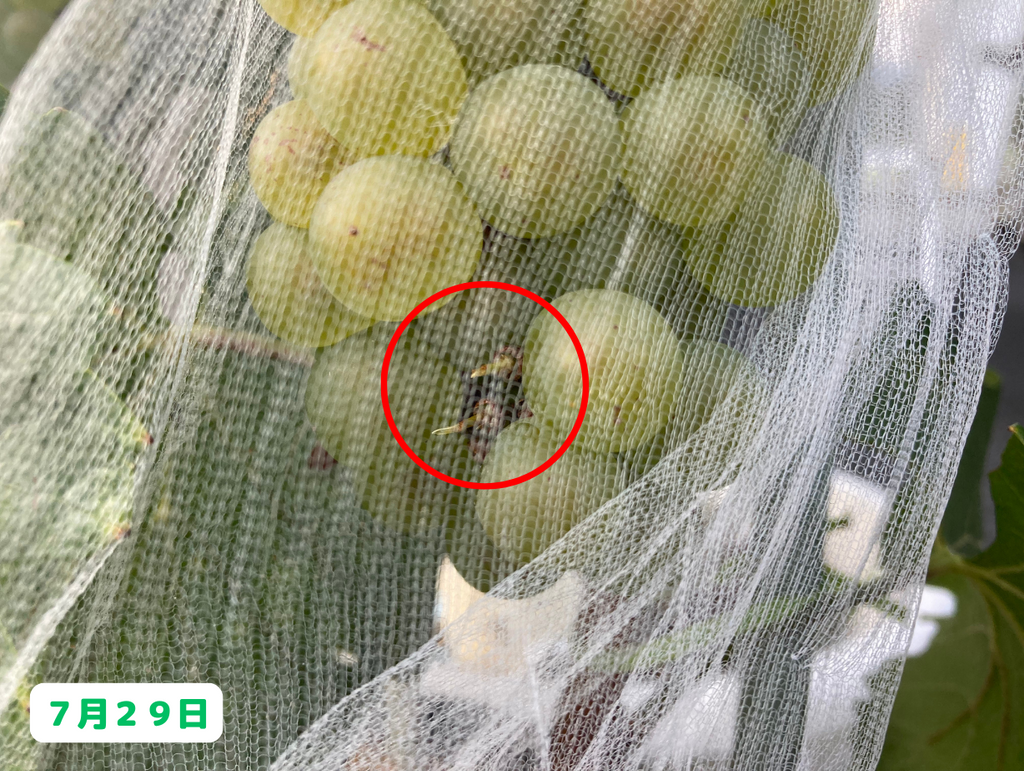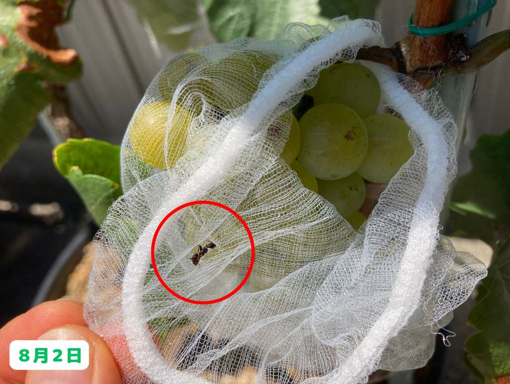 シャルドネちゃんの房のネットの中に、アリの姿を発見!ってことは、徐々に糖度が上がってきているのかもしれません!ただ・・・