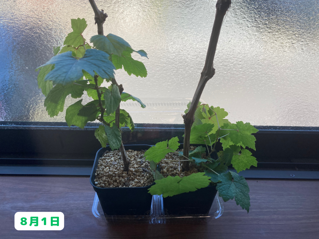 こちらも、以前と比べてそこまで変化がないように見えます。一方、室外の挿し木のブドウ達はと言うと・・・