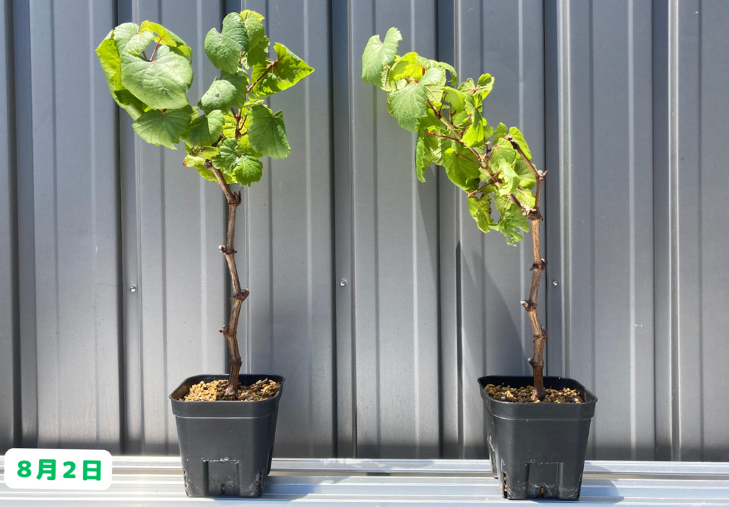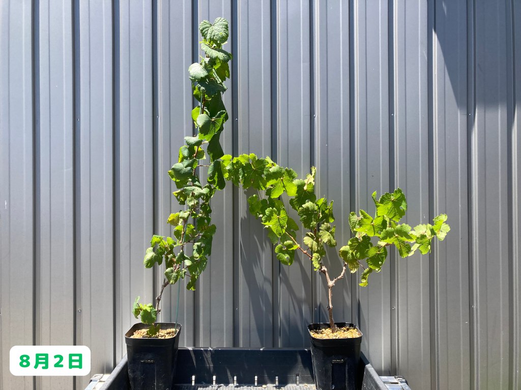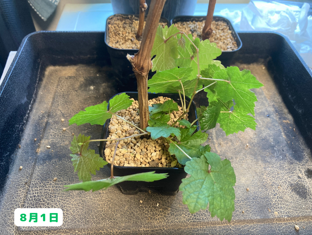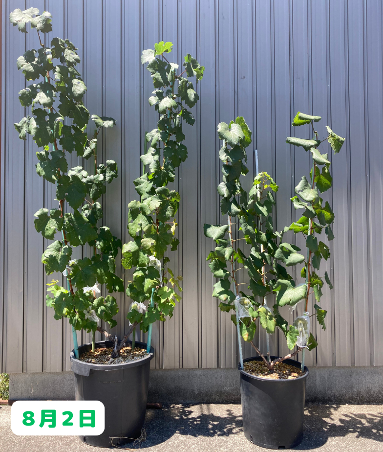 こちらも、やや成長が落ち着いてきた感じがあります。大きくなるのは今シーズンはここまでかな~。最後に鉢植えのブドウ達はと言うと・・・