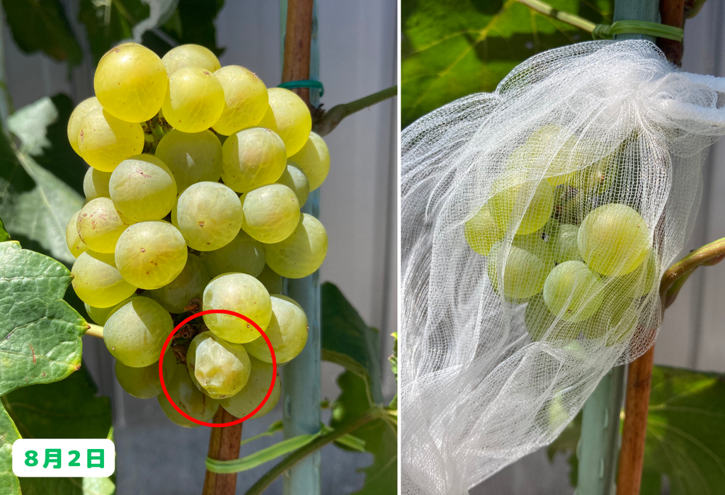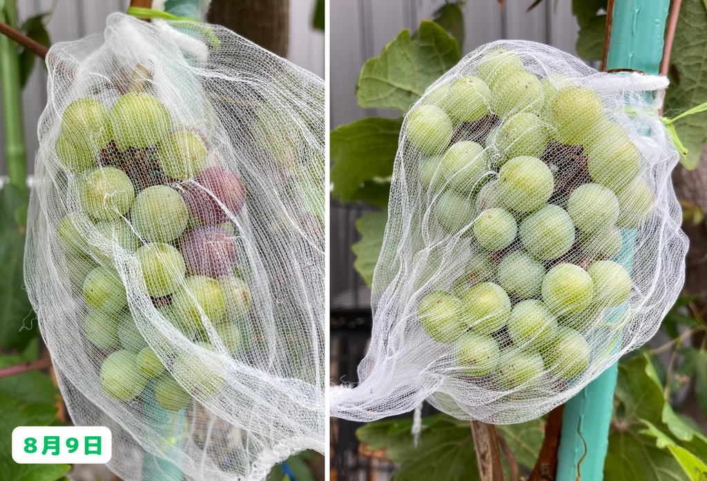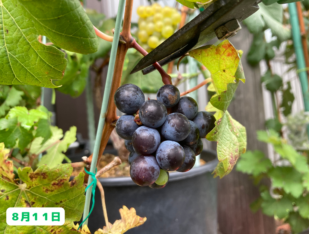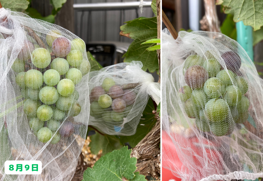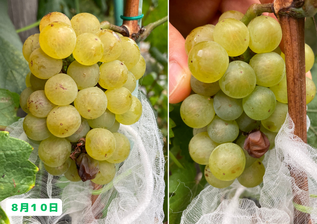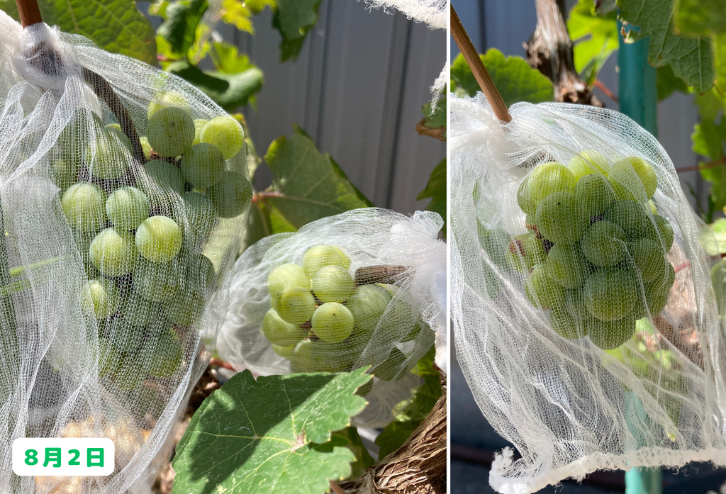 いや~、思わぬところで温暖化の弊害を実感することになりましたが、まあ実際にワインを造る訳ではないので、これはこれで良しとしましょう(笑)。そして、まだ収穫前の房も沢山あるので、そちらにも期待をしたいと思います!今後のブドウ栽培日記もどうぞお楽しみに!