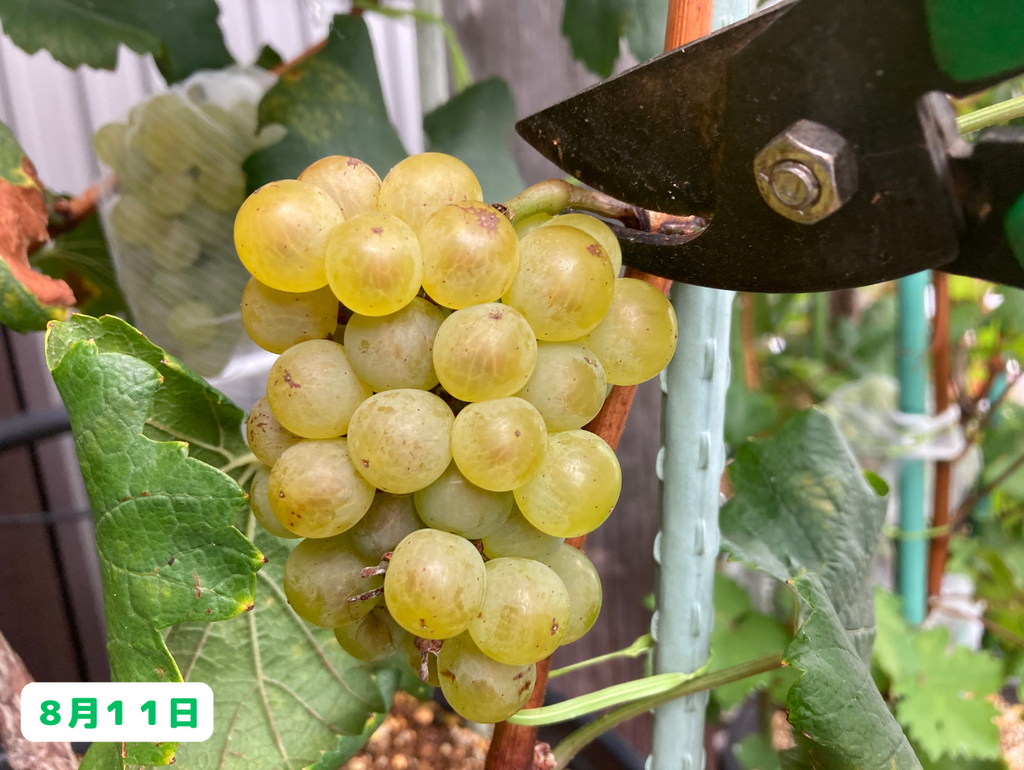 こちらのシャルドネちゃんの房が良い感じになってきたので(若干裏側にまだ緑色っぽい部分もありますが)・・・