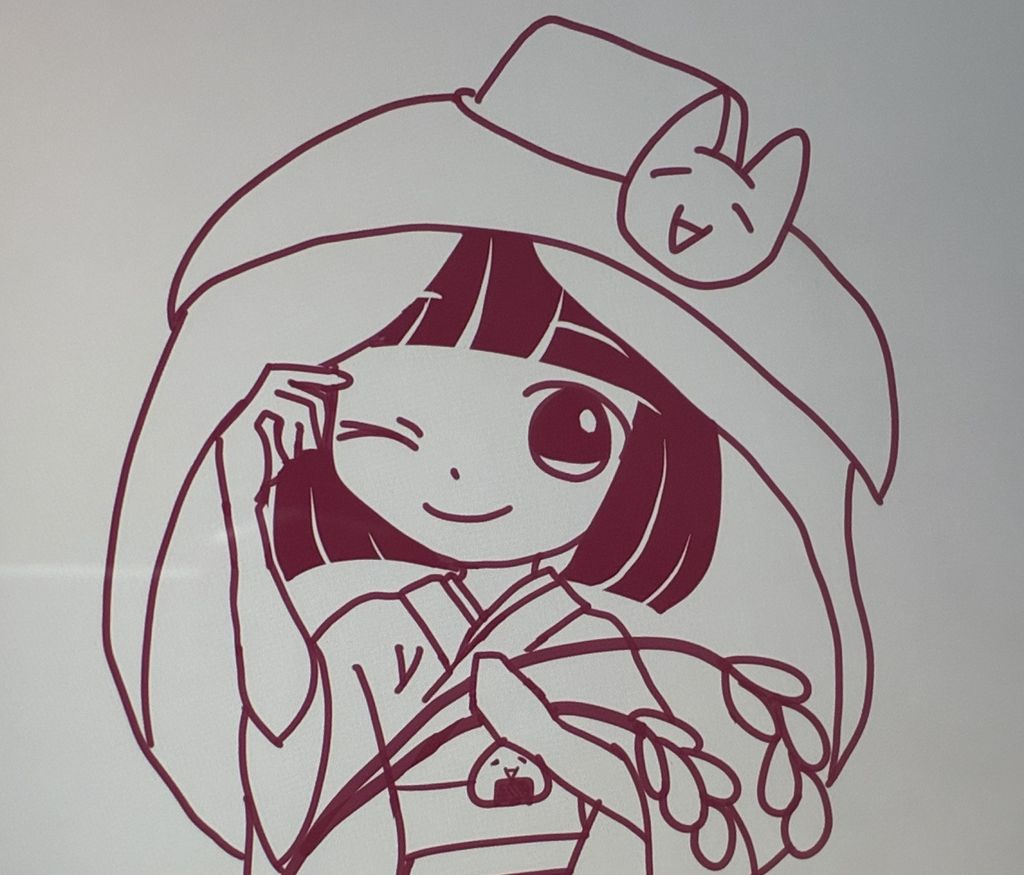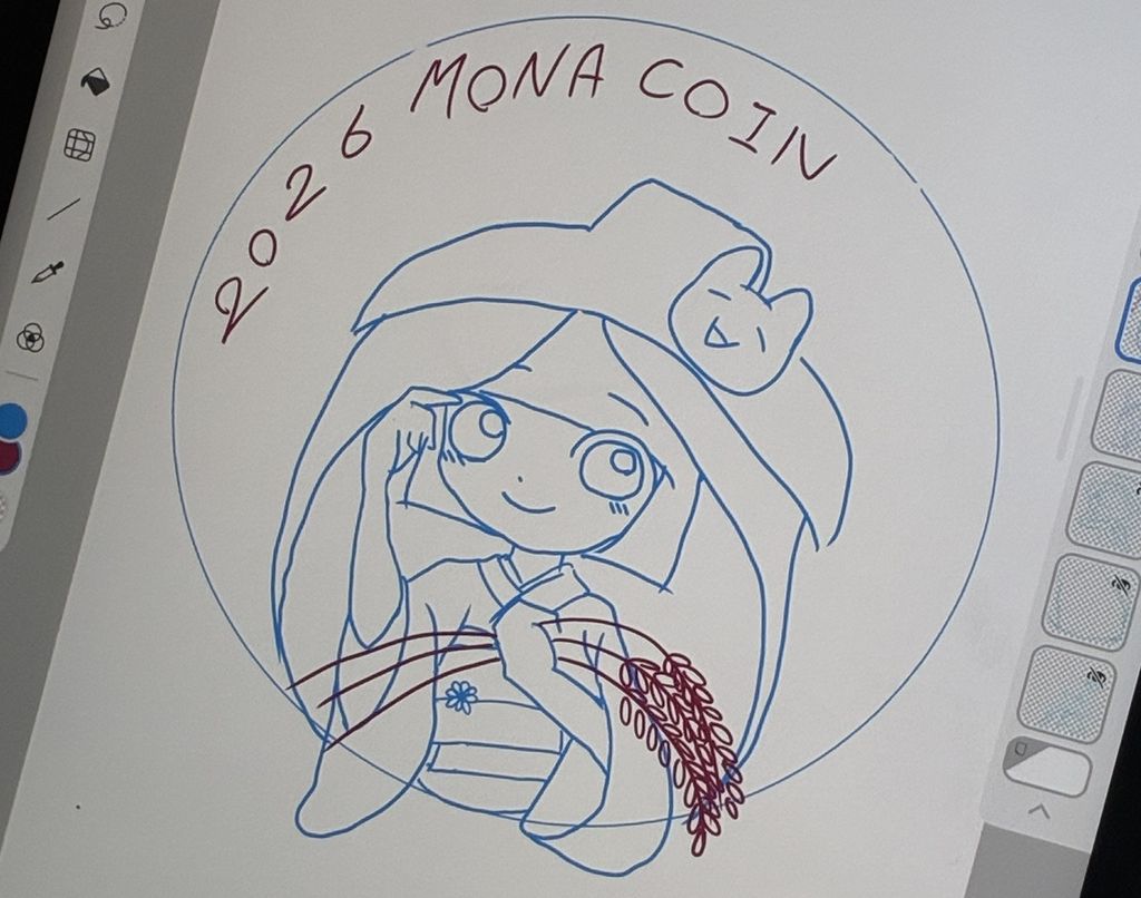 妹によるデザイン制作が始動!試行錯誤の末、ついに「市女笠」のポテンシャルに気づきメインアイテムに採用決定。あわせてテーマも『市女笠モナコインちゃん』へと刷新。稲穂の配置に悩みつつも構図が固めながら先へ邁進です。