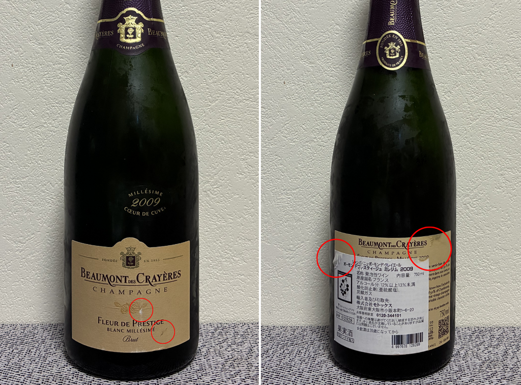ちょこちょこ傷や汚れがついていますね。おそらく、これぐらいなら通常品として販売するお店もあるかもしれませんが、シャンパンはご贈答用にされる方も多いので、当店ではラベル不良品として扱いました(まあ、ラベル不良を理由に自分で飲みたかったと言うのもあるのですが(笑))。さて、続いて登場したのは・・・