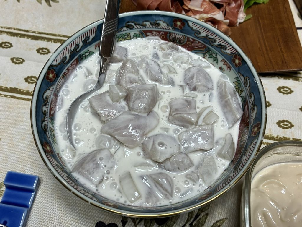 去年開催された大阪・関西万博でナウル共和国が一躍話題になったからです(笑)。この料理は、たまたまワイン会に参加した友人がナウル共和国に興味を持って作ってくれたのですが、実際に食べてみるとマグロとココナッツミルクの相性が意外にも良く、生臭い風味も一切なくて、これは・・・むしろ美味しい(笑)!そして、たまたま先ほどのワインが持つオーク樽由来のバニラやココナッツ系のニュアンスともばっちりペアリングをしていました(この瞬間だけワイン会がプチ万博と化しました(笑))!