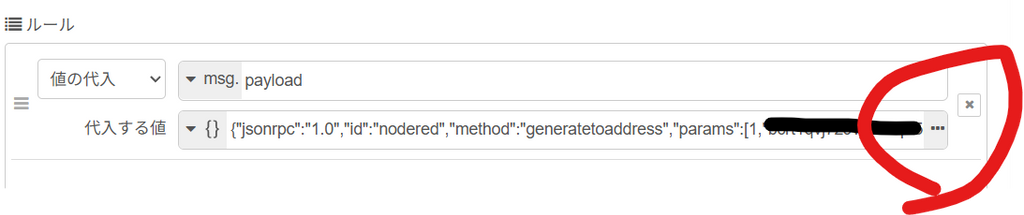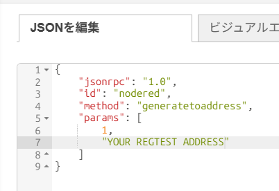 "to": "{\"jsonrpc\":\"1.0\",\"id\":\"nodered\",\"method\":\"generatetoaddress\",\"params\":[1,\"YOUR REGTEST ADDRESS\"]}",