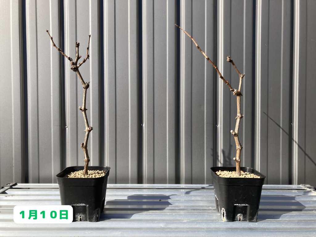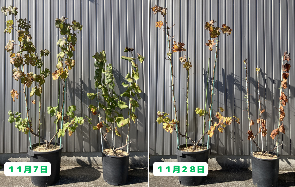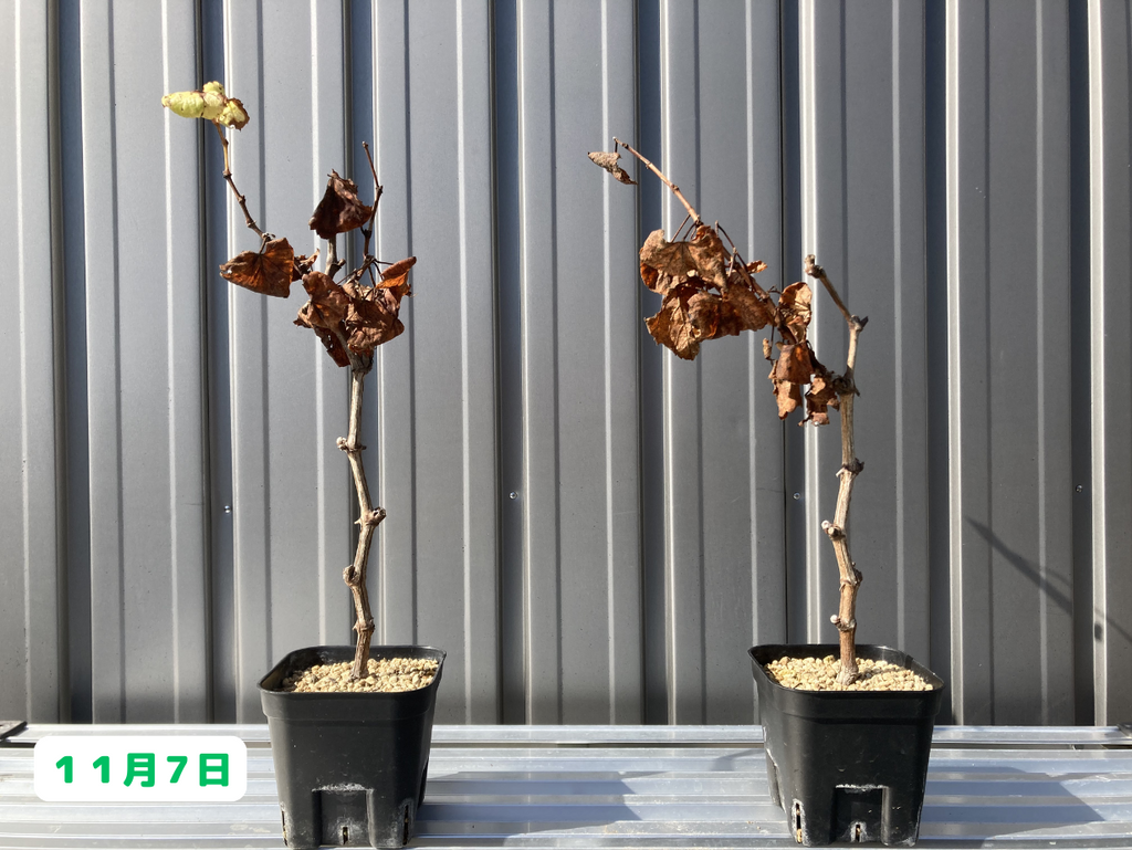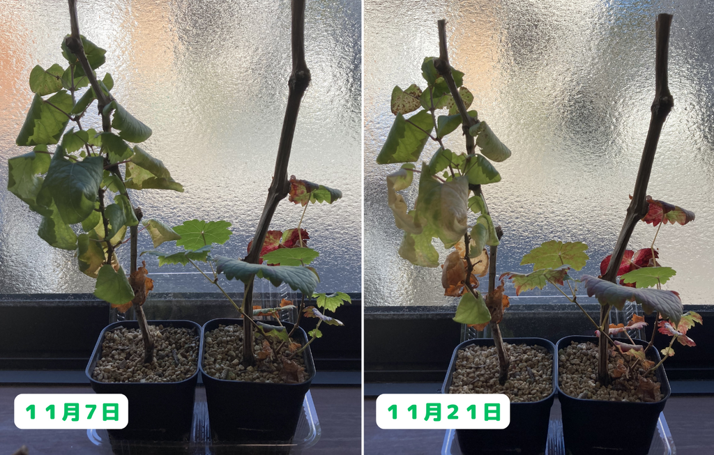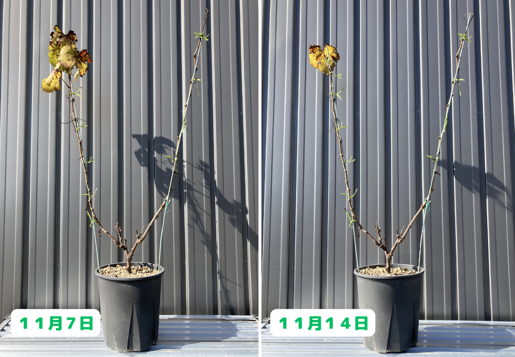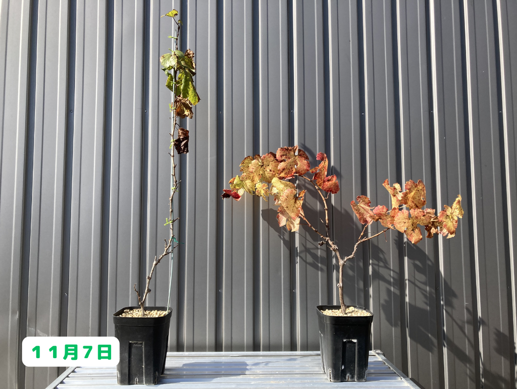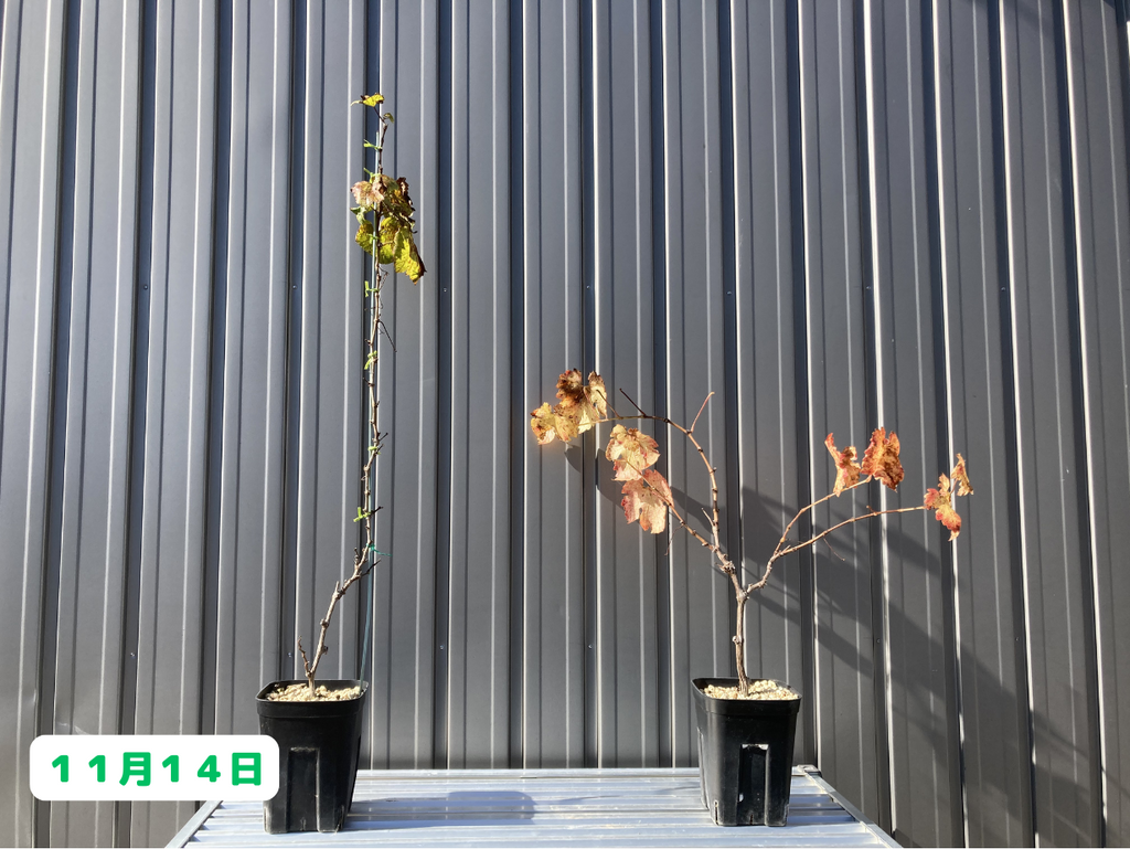 右側のブドウは、先輩カベルネとほぼ同じタイミングで全ての葉が落ちてしまいました。そして・・・