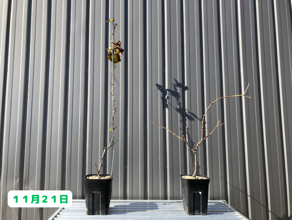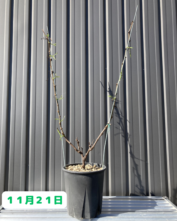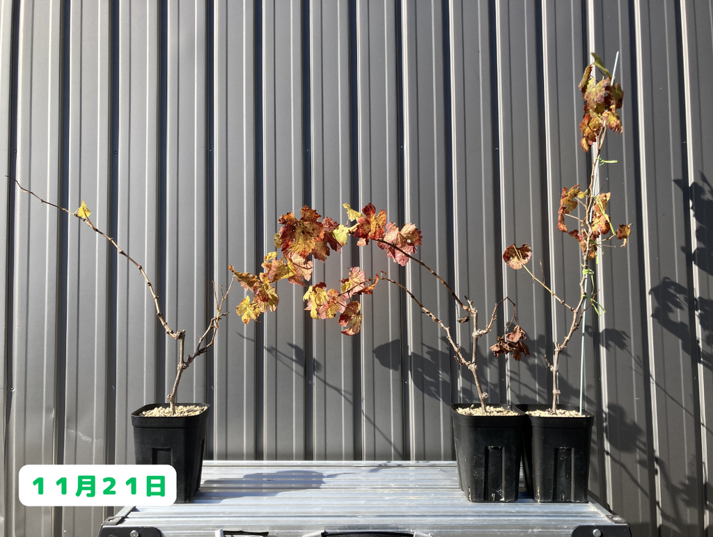 11月21日の時点では全ての葉が落ちてしまいました。うちのブドウ達の中では一番乗りでした(笑)。続いて落葉が早かったのは・・・