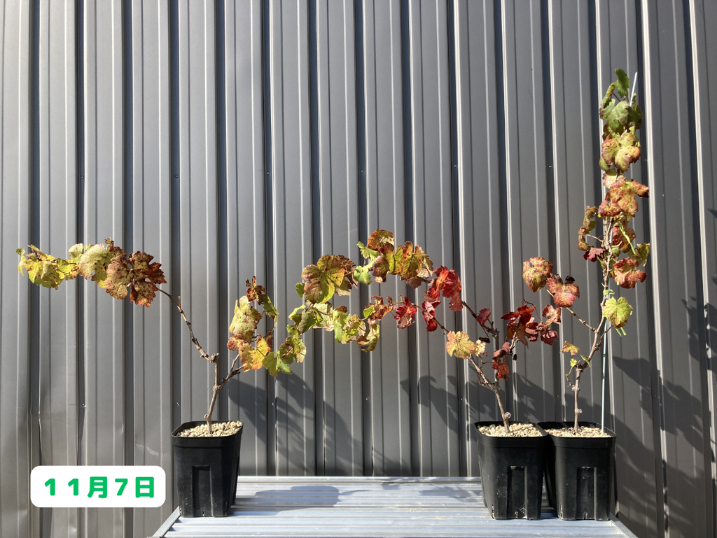 鉢植えのブドウ達!11月の頭にはまだ沢山の葉がついていましたが、後半になると一気に落葉が進みました。ちなみに・・・