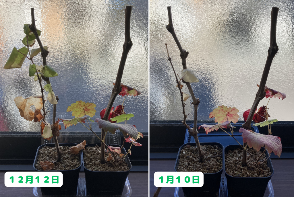 こちらは、葉と枝を繋いでいた葉柄(ようへい)と呼ばれる部分ですが、このサイズのブドウになってくると、この葉柄の部分も太くて長い!右側は細い枝の葉柄ですが、太い枝の葉柄と比べるとかなりの差があります。・・・それはさておき、その後12月に入ると・・・