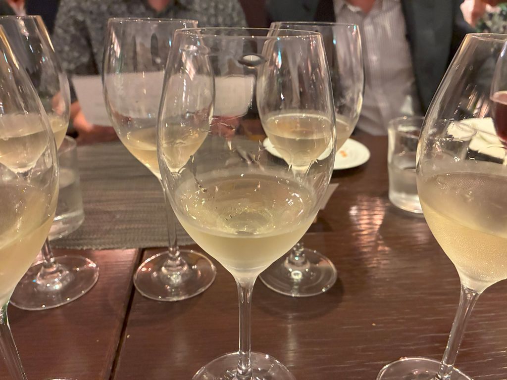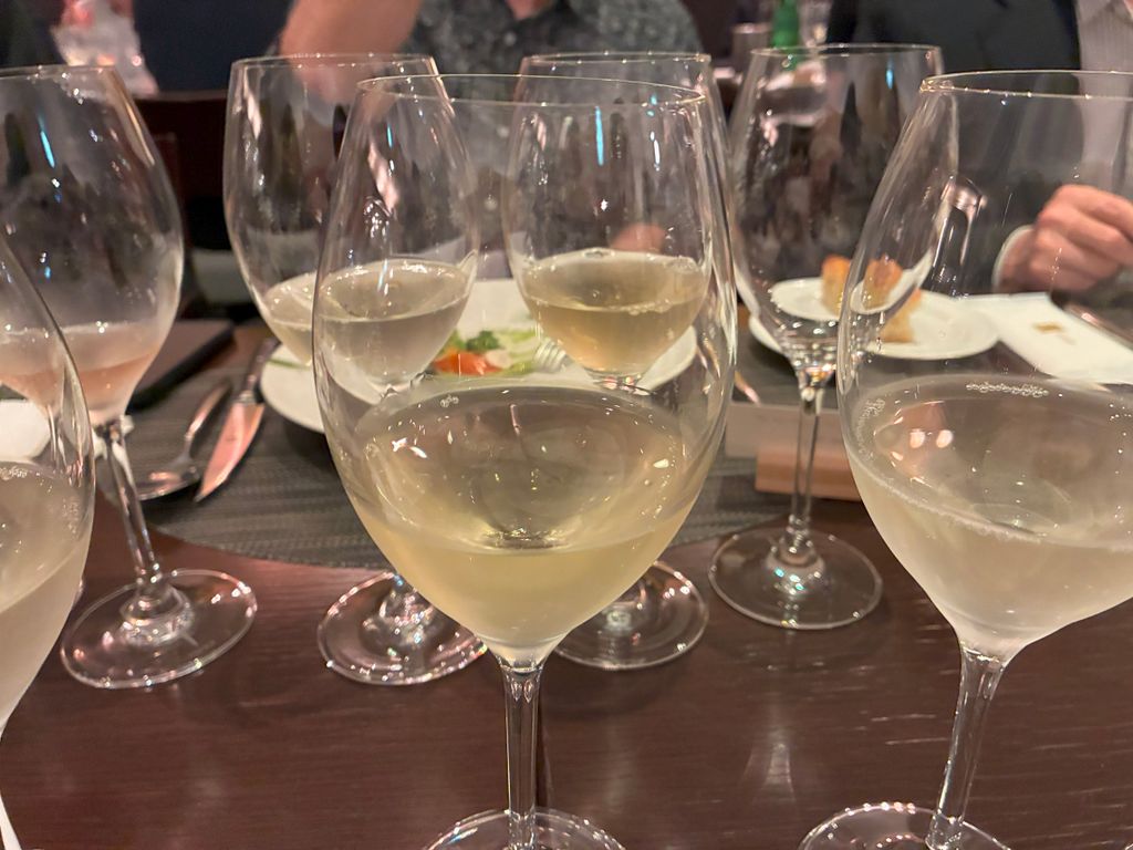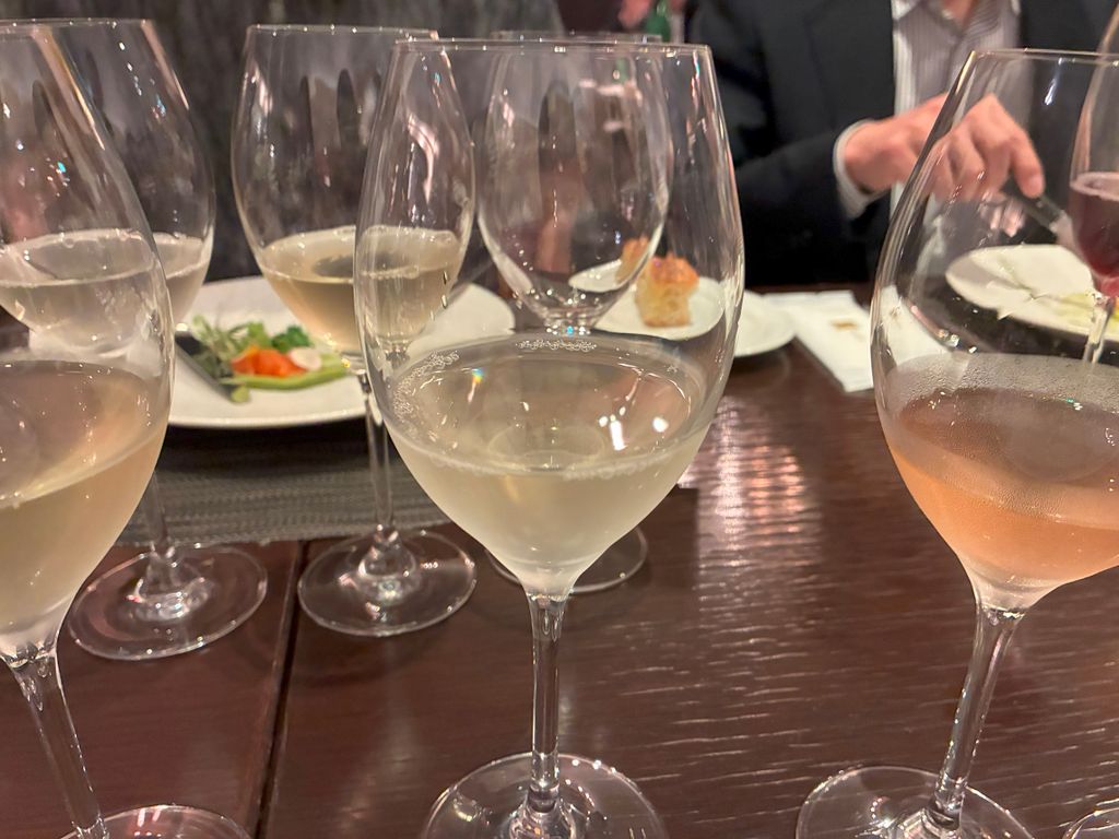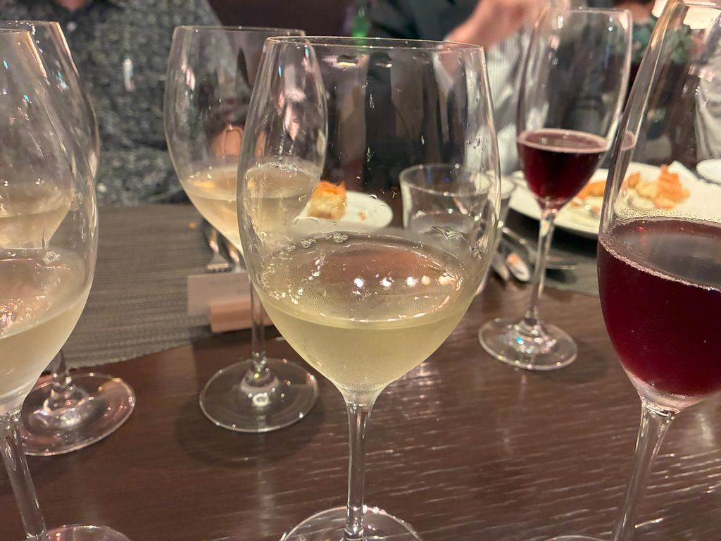 「サントリン グラディーズデール シャルドネ 2021」と、一気に沢山のグラスにワインが注がれていきました!・・・ぱっと見、どれがどのワインかわからなくなりそうですが、今回ワインは全部で11種類もあるので、どうやらこれぐらいのペースでどんどん出てくるようです(笑)。そして、また次もワインか!?と思ったら、今度は・・・