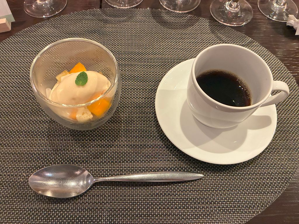 デザートの「マンゴーのパルフェ レザーウッドハニーのアイス 〜エキゾチックなフルーツと新生姜のコンフィ添え〜」に、コーヒーと・・・