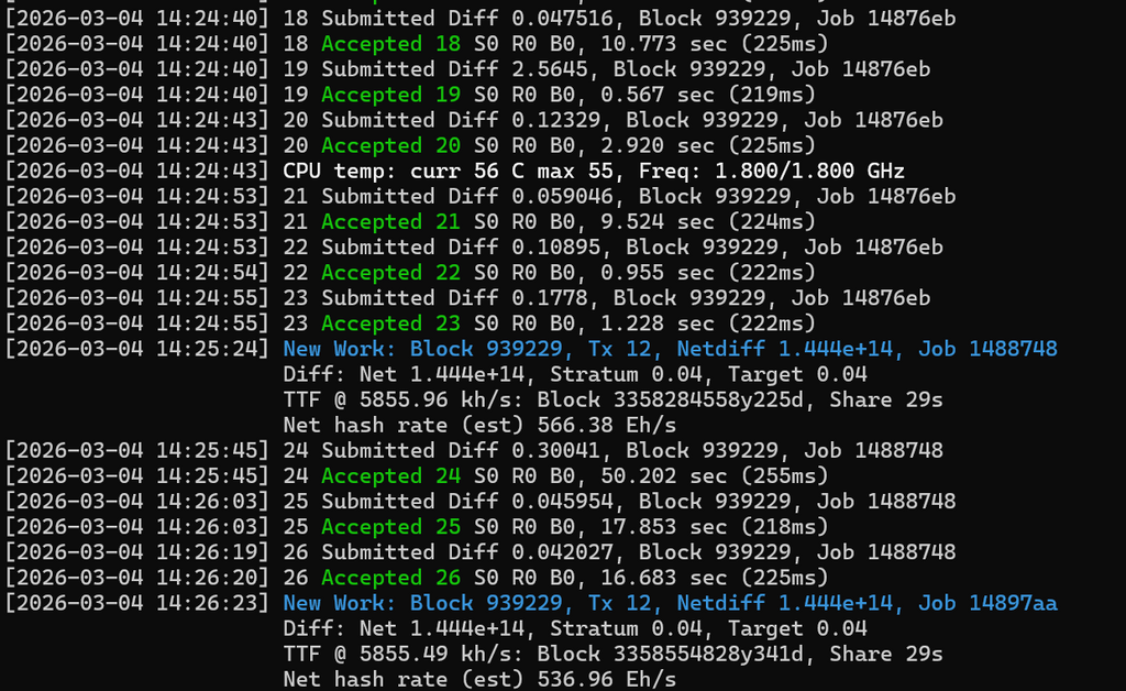 そのため、この先 accepted (シェアの提出)が出たとしても、それは「ちゃんと計算機が動いているよ」というプールへの生存報告のようなものであり、33億年の確率の壁を打ち破って「ブロック」を見つけない限り、報酬はゼロです。