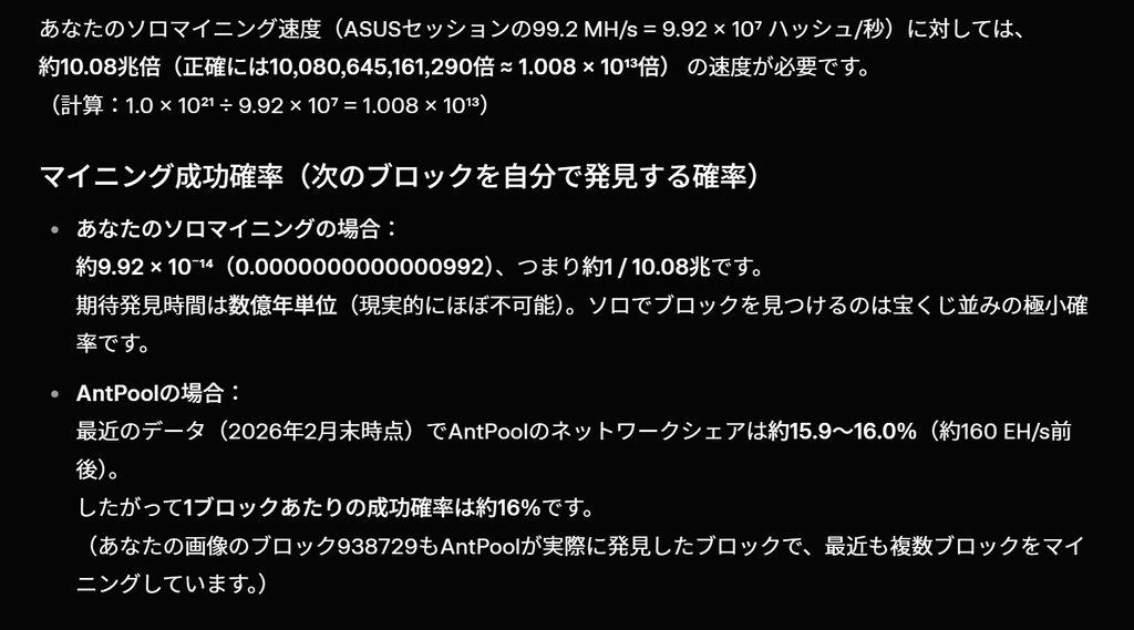 ソロマイニングの成功確率:0.0000000000000992% (1/10兆)