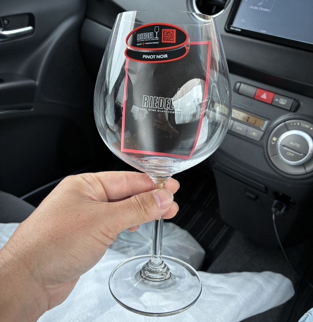 リーデルのピノ・ノワール用ワイングラスの写真が!話を聞くと、今度はリサイクルショップで定価よりも安く手に入れたとのこと。ちなみに、リーデルとは世界的にも有名なグラスメーカーで、かくいう私も・・・