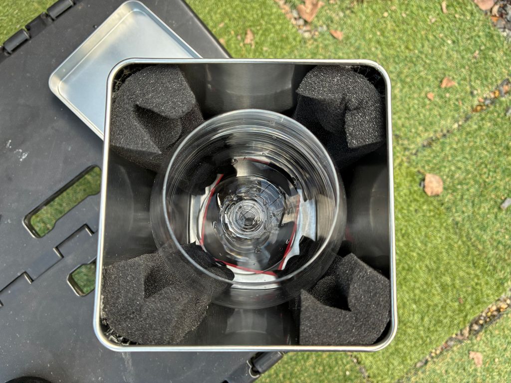 このようなリーデルの箱に入っています。そこで、すぐに友人に尋ねてみると・・・なんとこのケースは自分で作ったとの答えが(笑)!どうやら、リサイクルショップで買ったリーデルグラスは箱無しだったそう。そこで、箱がないなら作れば良い、って思ったんだそうです(さすがはDIYの友人(笑))。材料は100円ショップで売られていた缶と緩衝材を使用したそうですが、これが・・・