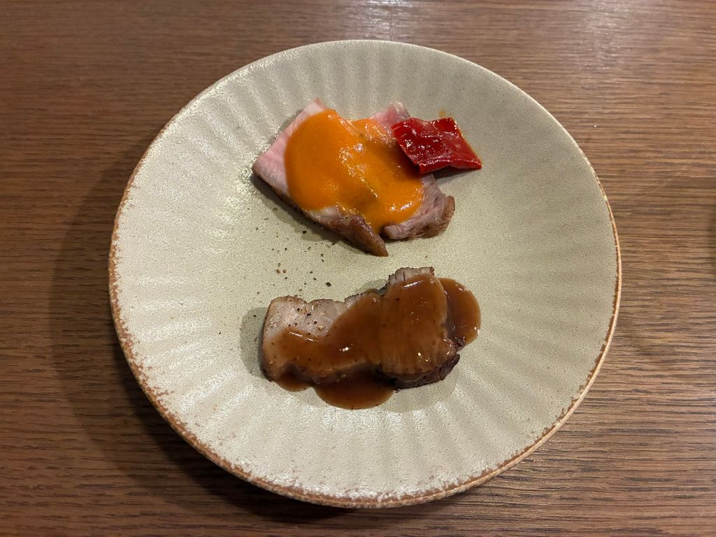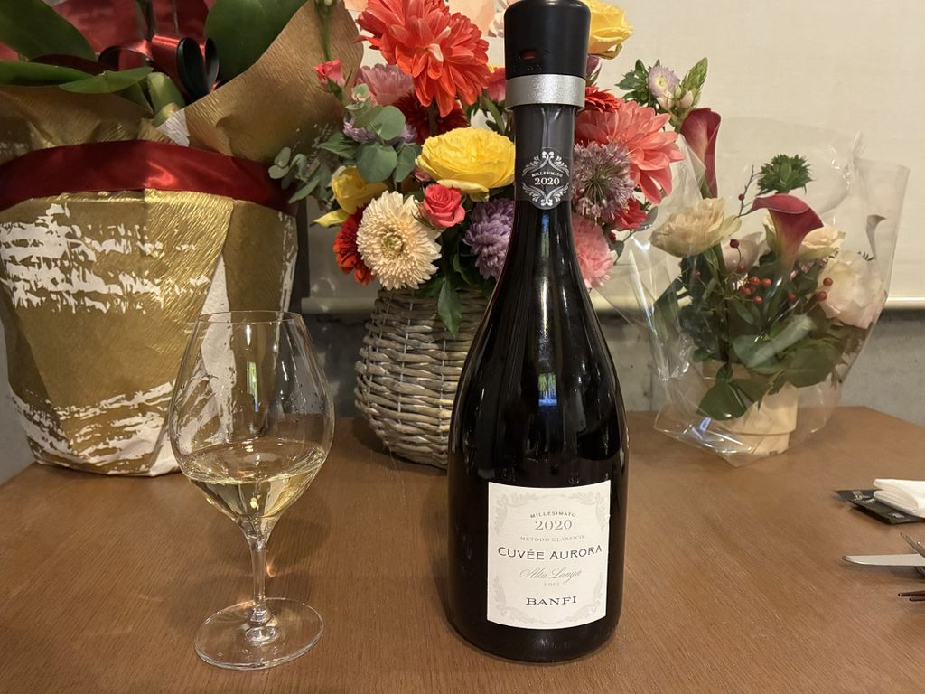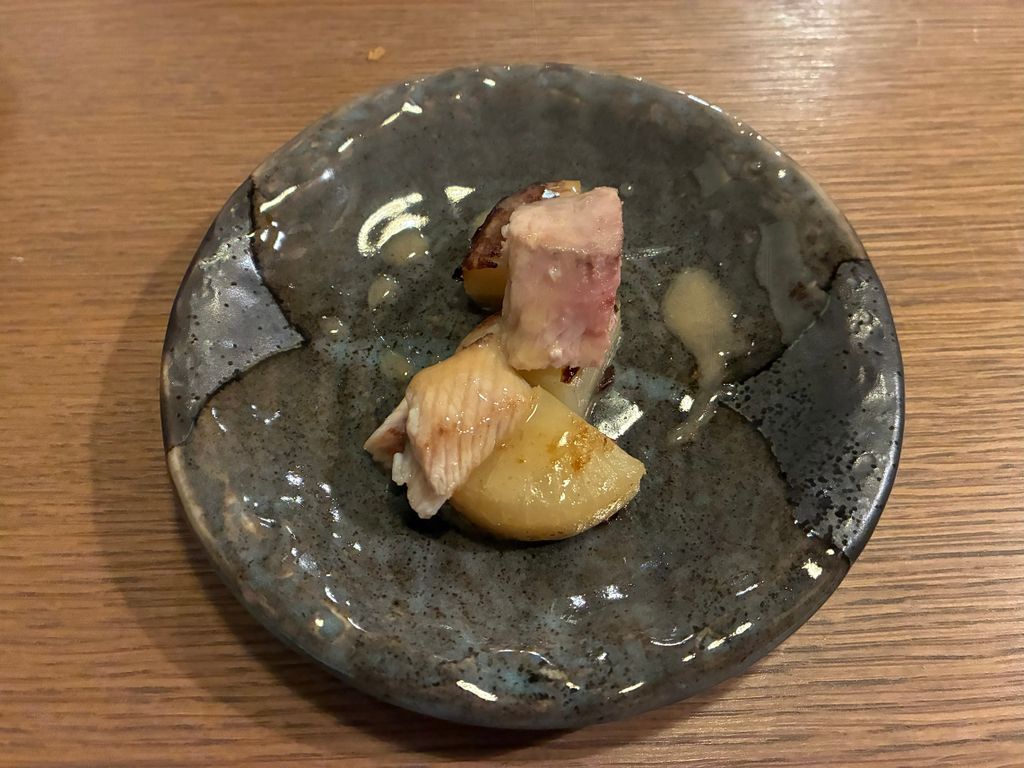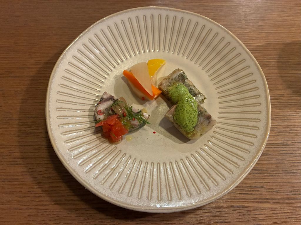 イタリア・ピエモンテの「バンフィ キュヴェ・アウローラ アルタランガDOCG 2020」で、アピスさんからの振る舞い酒でした(ありがとうございます!)!ピノ・ノワール70%、シャルドネ30%で、黒ブドウ由来のコクが感じられ、また熟成期間30カ月と言う非常に長い熟成からくる香ばしい風味が堪らないワインでした!さて、今回もお料理は完全におまかせしていましたが、まず登場したのは・・・
