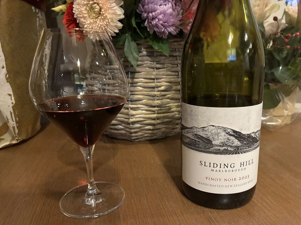 赤ワインをオーダー!先ほど登場したニュージーランド・マールボロのアンツフィールドが手掛ける「スライディング・ヒル ピノ・ノワール 2023」をチョイス!なぜなら・・・