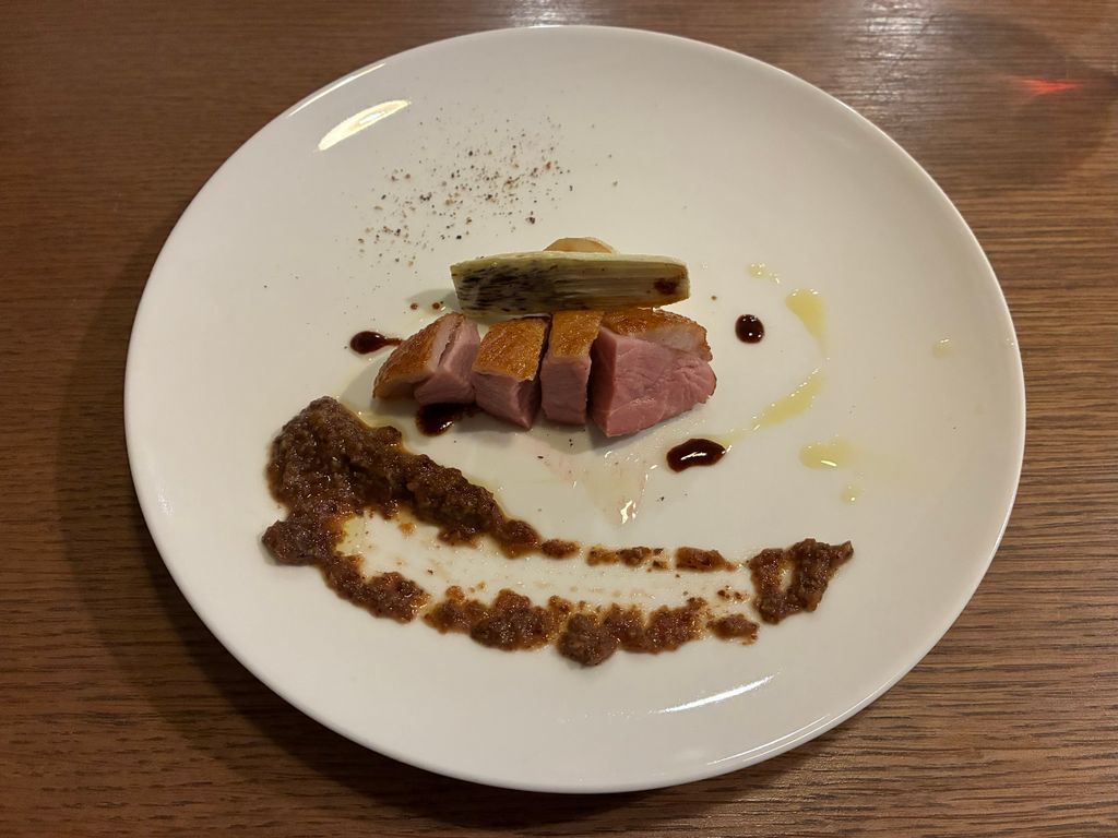 白ワインをオーダー!チョイスしたのはニュージーランド・マールボロの「アンツフィールド シングル・ヴィンヤード ソーヴィニヨン・ブラン 2023」!実は、私はワーホリ時代にこのワイナリーに行った事があり、当時マールボロの中で一番美味しいソーヴィニヨン・ブランだと思っていたのですが、久しぶりに飲んでみると・・・うん、やっぱり美味しい!ハーブの香りにグァバなどのトロピカル系フルーツのニュアンス、果実味とフレッシュな酸味のバランスも良くて、さすがのクオリティでした!続いて登場したのは・・・