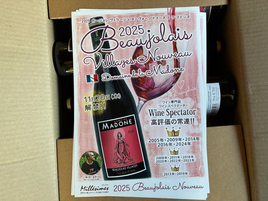 別の箱を開けると、今年もヌーヴォーの販促用のポスターが同梱されていました。ちなみに、このポスターにも大きく書かれていますが、去年の2024年ヌーヴォーは、ワイン専門誌「ワインスペクテーター」で1位(88点)を獲得!そんなマドンヌのボージョレ・ヴィラージュ・ヌーヴォー・・・