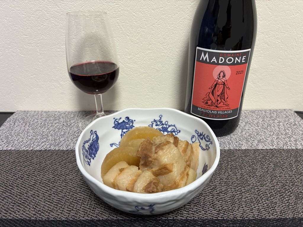 ヌーヴォーに良く合うんです!豚バラの脂の甘味、そして旨味をたっぷりと吸った大根の味わいが、ヌーヴォーの軽やかなタンニンと果実味によってより引き立てられるのです!ぜひお試しあれ!
