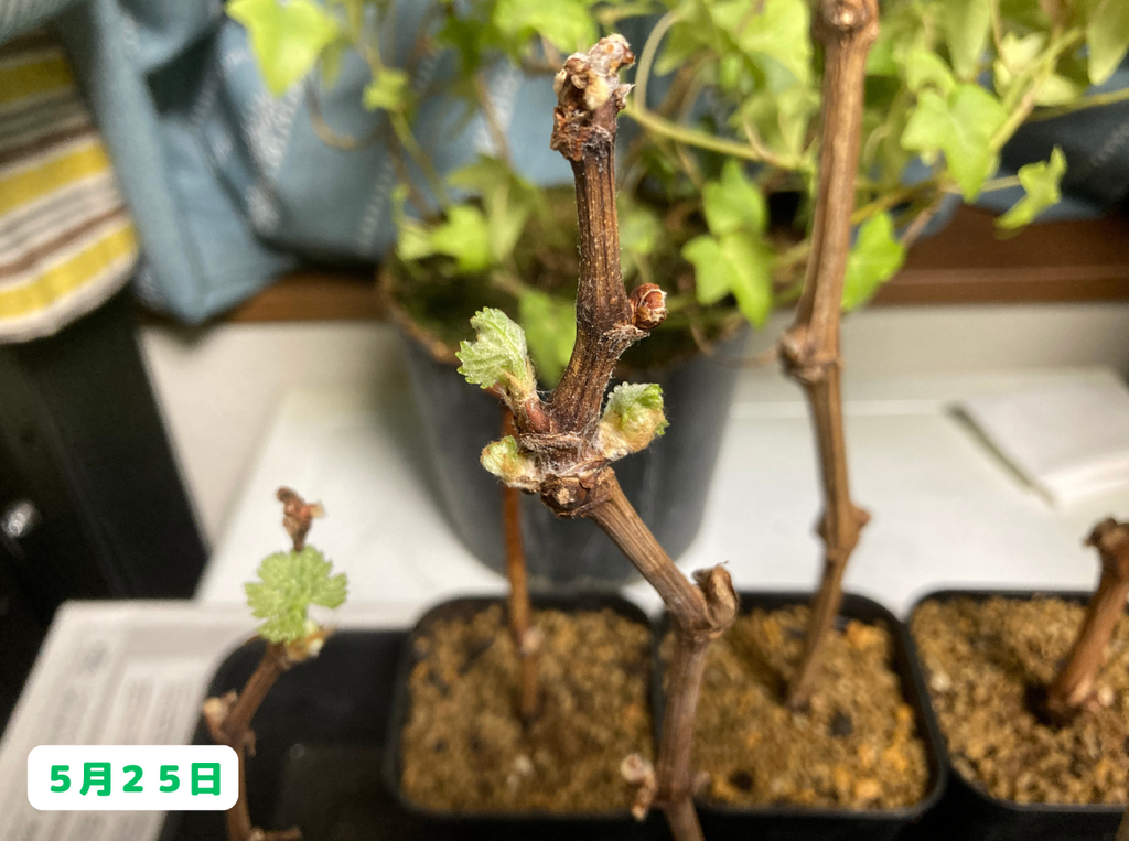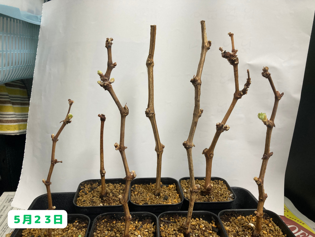 まずは挿し木のブドウ達ですが、ついに新芽が出てきました!