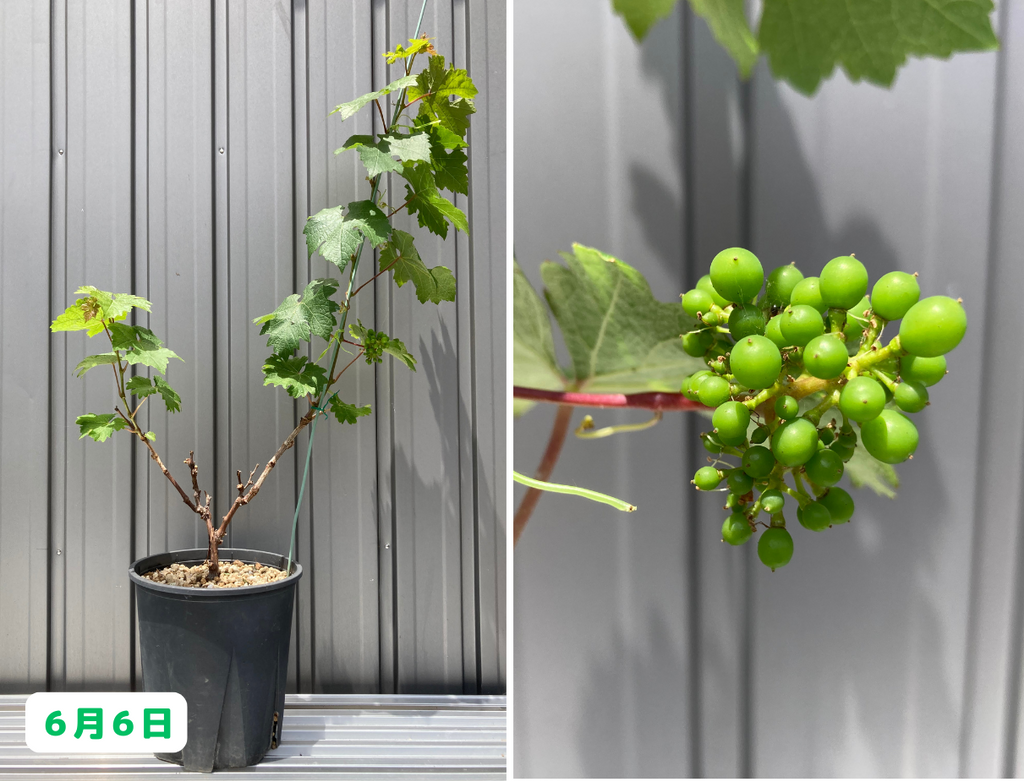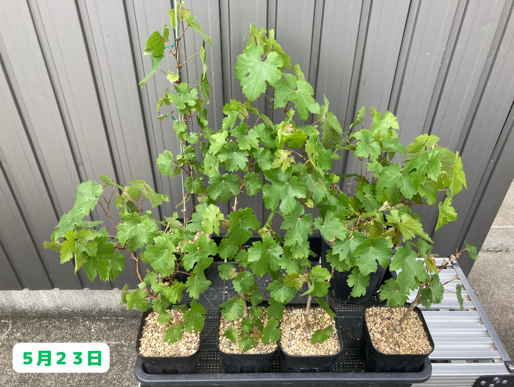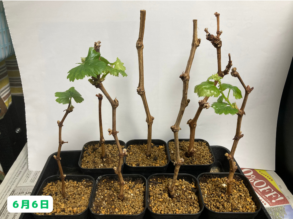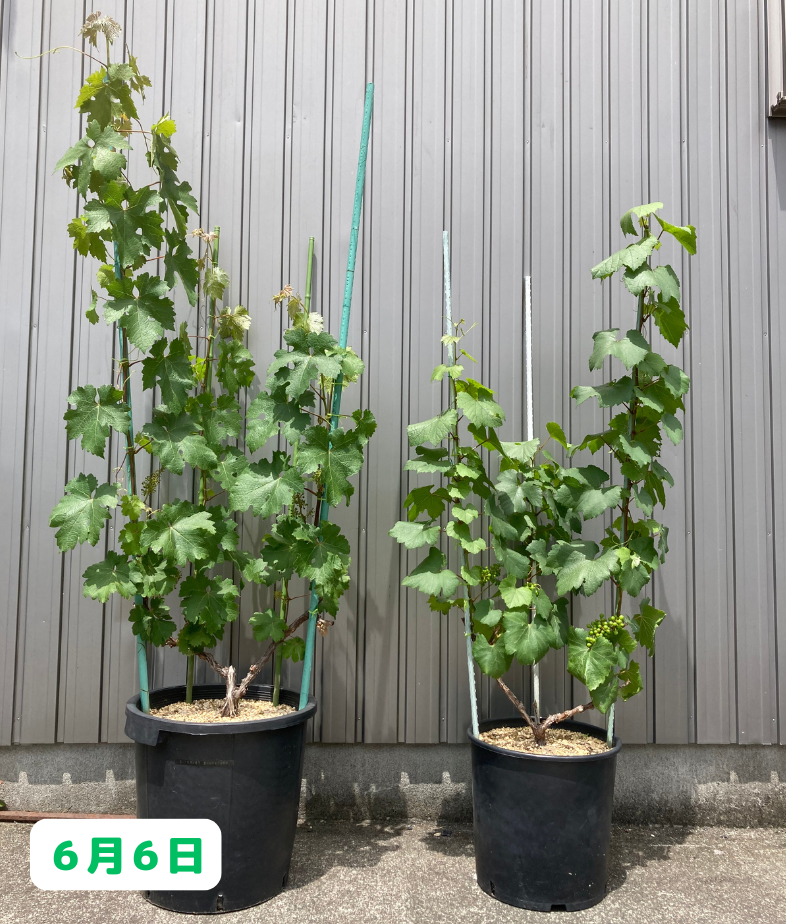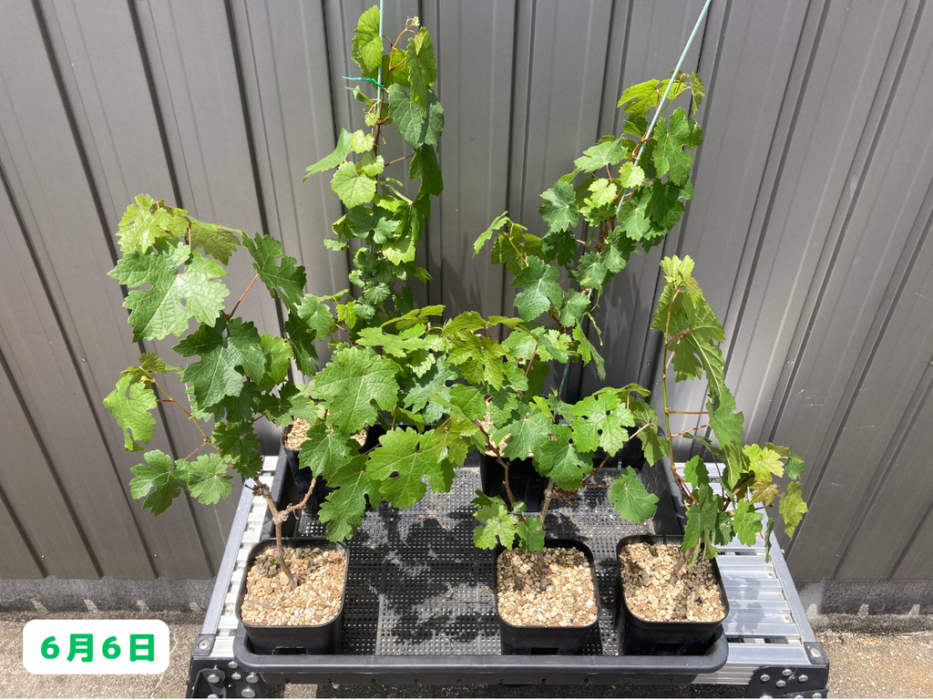 6月にはここまで成長しました!ただ、後ろの列のカベルネ達には一切変化が見られないので、こちらに関しては引き続き注視していきたいと思います。さて、一方の小さい鉢植えのブドウ達はと言うと・・・