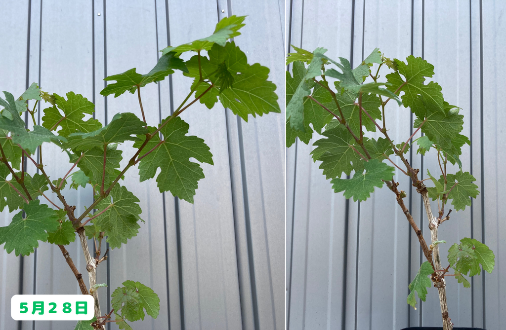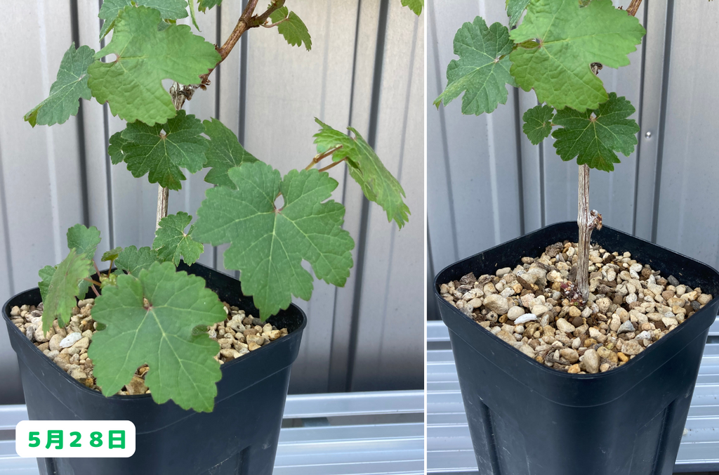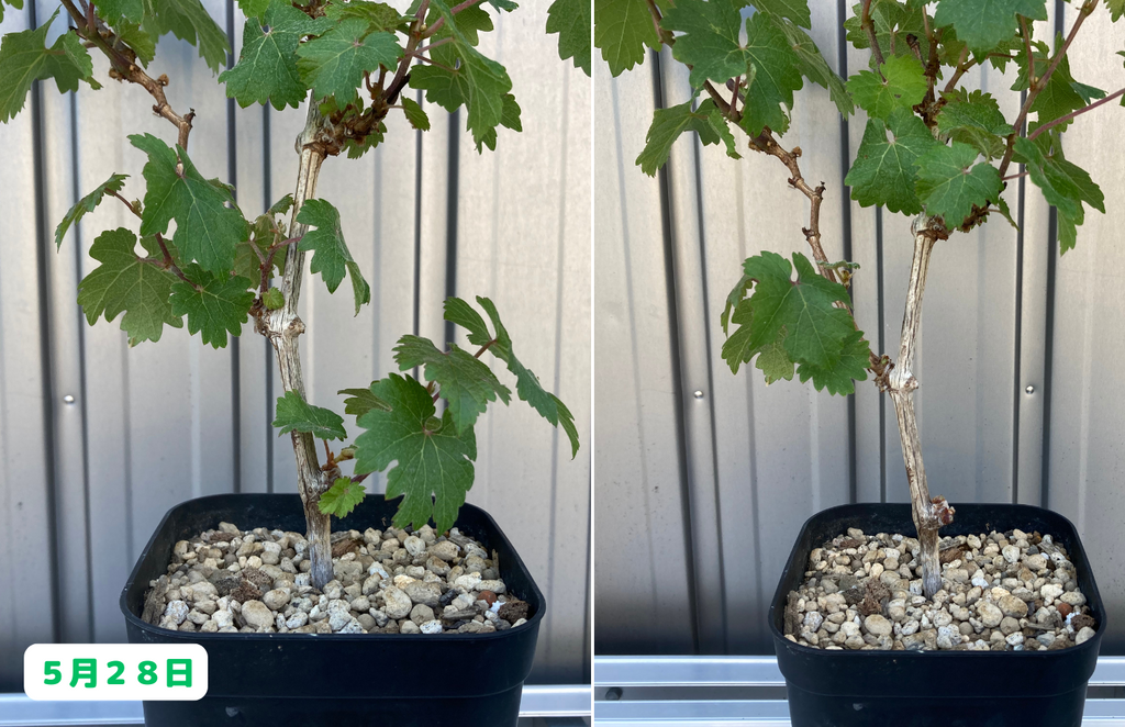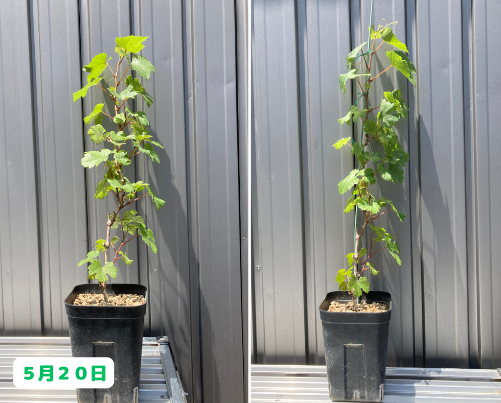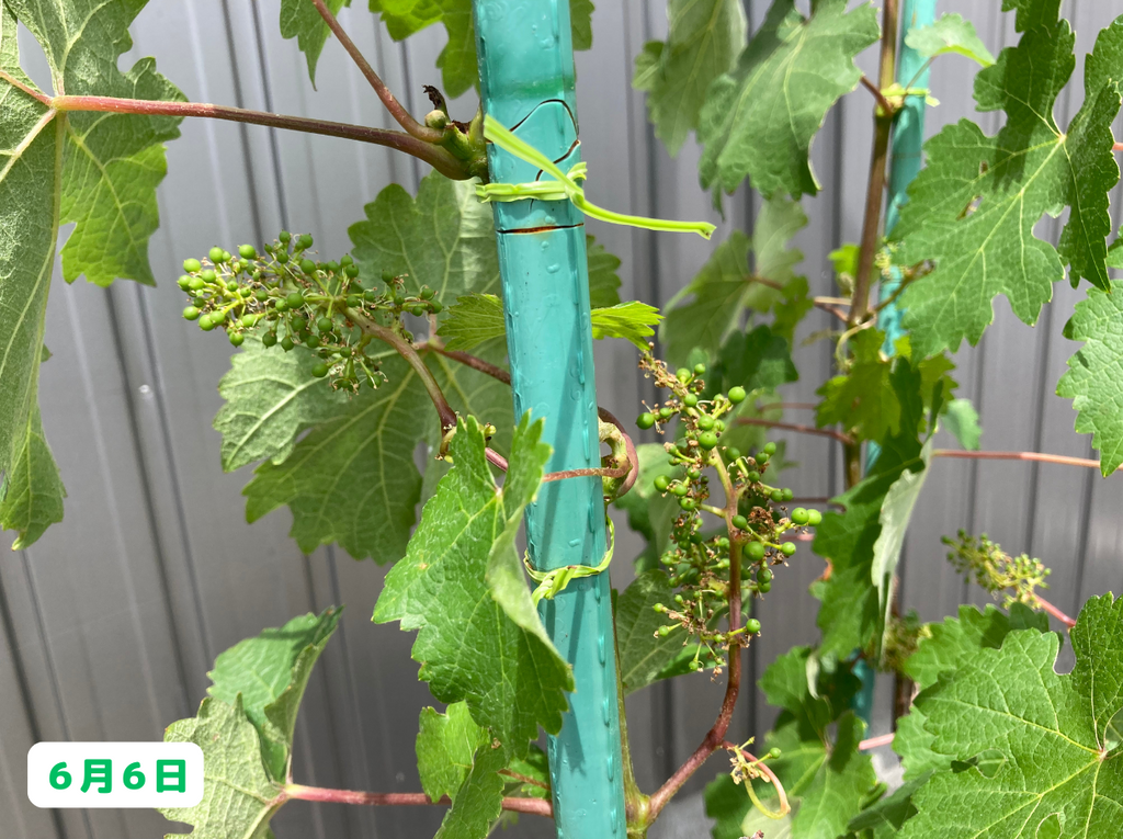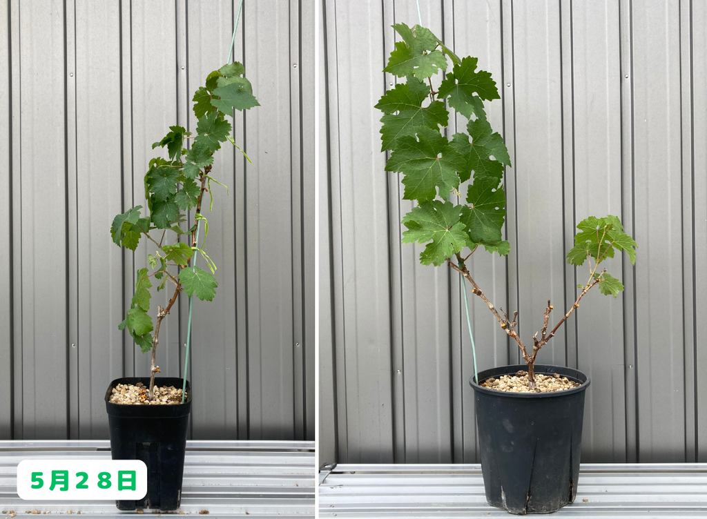 みなさんこんにちは。園芸素人の私がブドウ栽培に挑戦すると言うこの企画、前回は鉢植えのシャルドネちゃんとカベルネちゃんの間引き剪定と支柱への誘引作業を行いました。さて、その後の様子はと言うと・・・