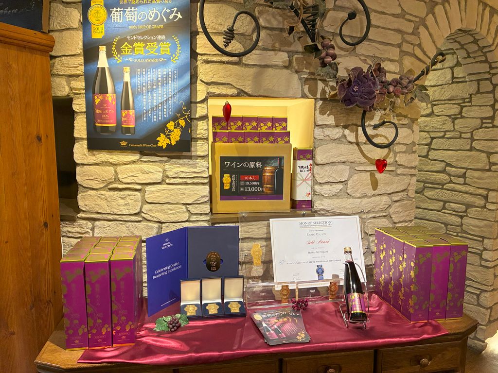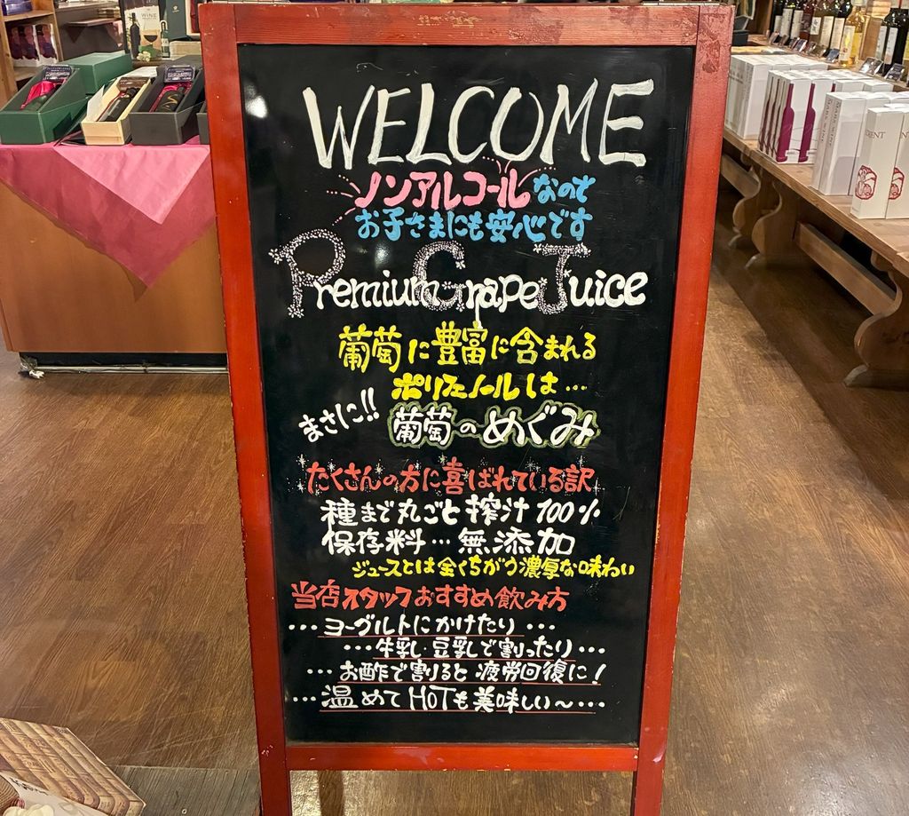 こちらの看板を発見!話を聞くと、ノンアルコールのブドウジュース「葡萄のめぐみ」と言う商品も販売していて、こちらの無料試飲も出来るとのこと!お~、これなら友人家族も楽しめるじゃん(我々の罪悪感も少しは薄れる(笑))!そこで、友人家族はブドウジュースの試飲を、そして我々はワインの試飲をすることに!まずは・・・