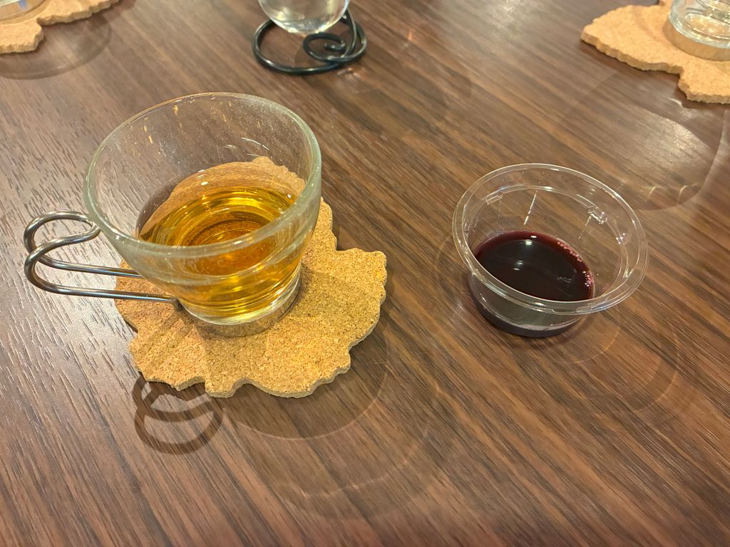 スタッフの方が我々にも葡萄のめぐみ(ブドウジュース)と、ジャスミン茶を用意してくれたのですが(写真には写っていませんが、レーズンの試食も用意してくれました)、このブドウジュースが非常に美味しい!