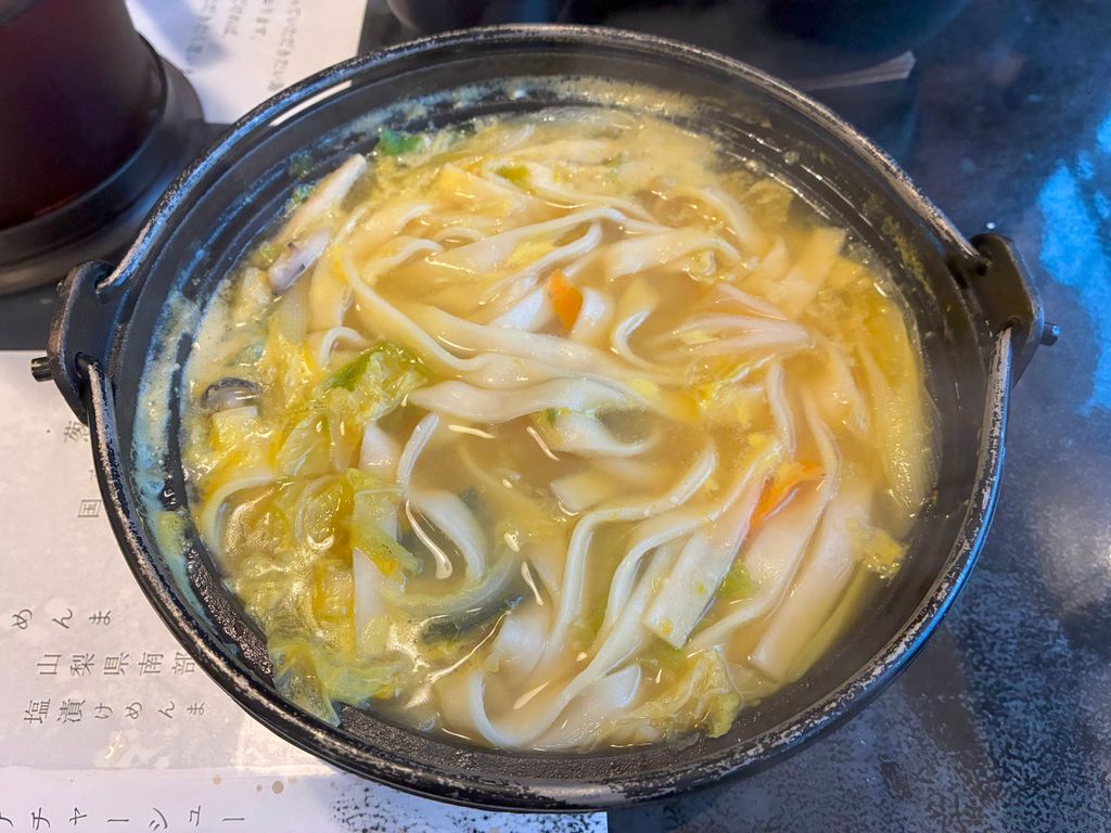 ほうとうでしょう(笑)!甲州地鶏を使い、お野菜も沢山入ったボリューム満点のほうとうで、気温も少し肌寒い感じだったのでとても美味しかったです!