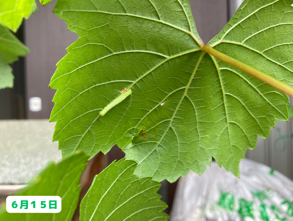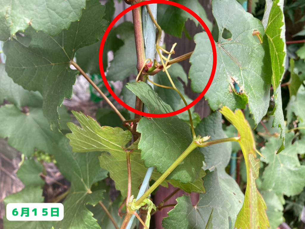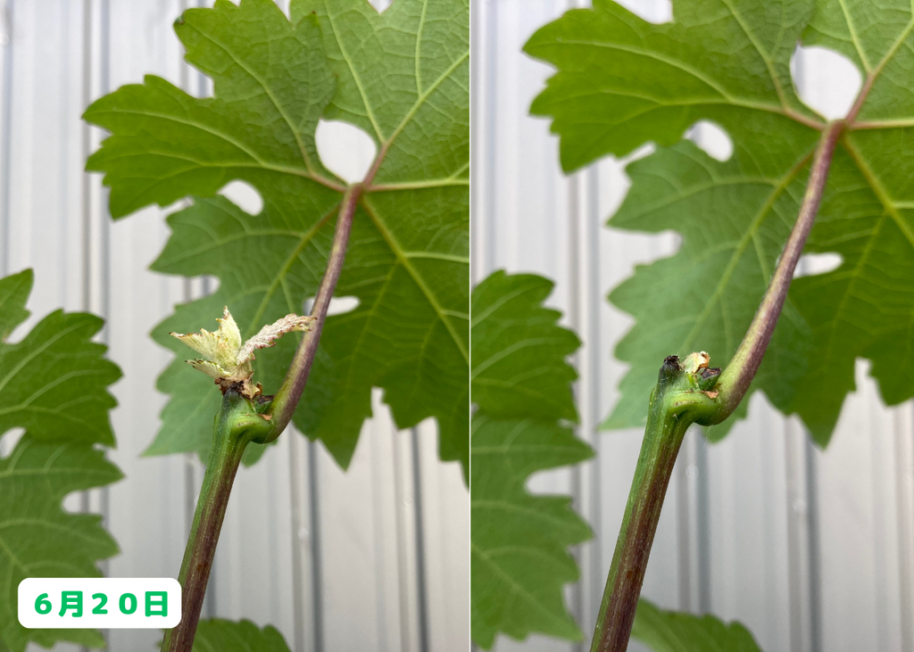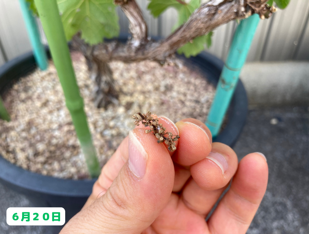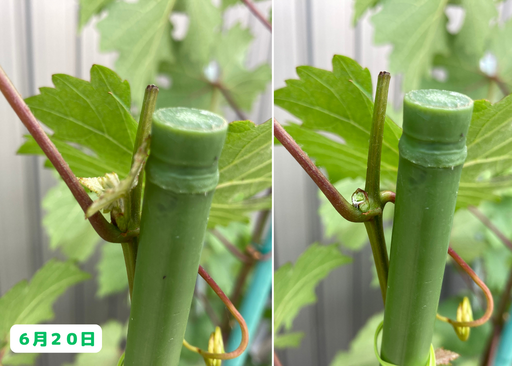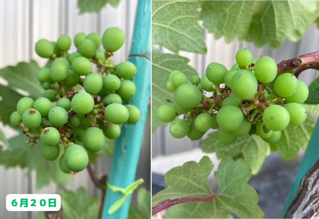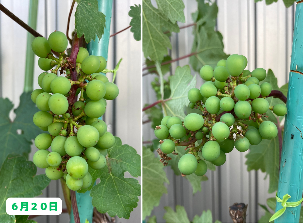 房の間に、大きくなれずにそのまま枯れてしまった、実となるはずだった部分がいくつか残されていました。生育不良でも起こっているのでしょうか、シャルドネちゃんが順調なだけにカベルネちゃんに関しては少し心配な状況です。この先、ちゃんと収穫出来る状態まで成長してくれるのか、今後のブドウ栽培日記もどうぞお楽しみに!