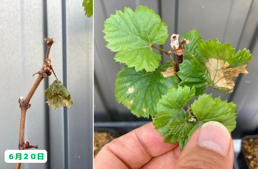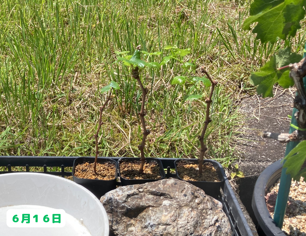 この頃になると、粒の数こそ少ないですが、立派な大きさの房に成長!今後が非常に楽しみです!一方、挿し木のブドウ達はと言うと・・・