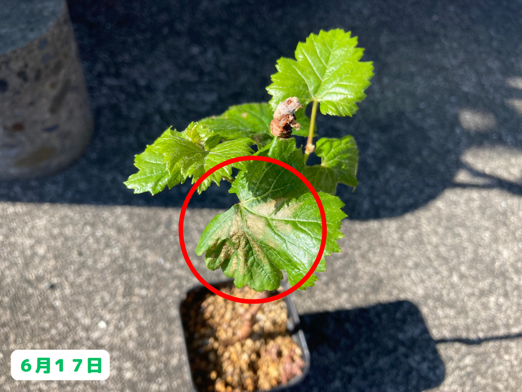 なんと葉っぱに葉焼けの跡が!つまり、人間の日焼けと同じ現象が起きてしまいました。室内から室外に出す場合、通常最初は日陰などで慣らしてから日光に当てるようにしますが、今回は完全に油断してしまいました。さらに・・・
