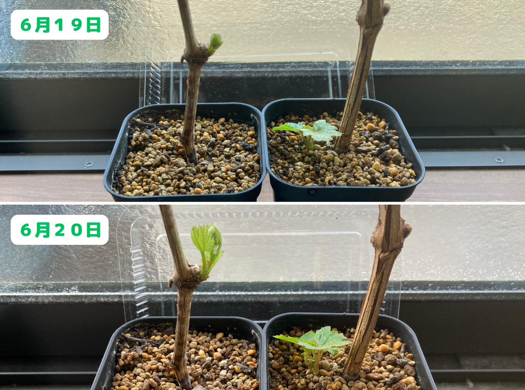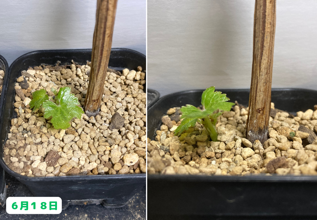 おそらく、この挿し木はもうダメかもしれません。ただ、葉焼けした挿し木に関しては、新たに元気な葉っぱが出始めたので、なんとか持ちこたえてくれそうです!そして・・・