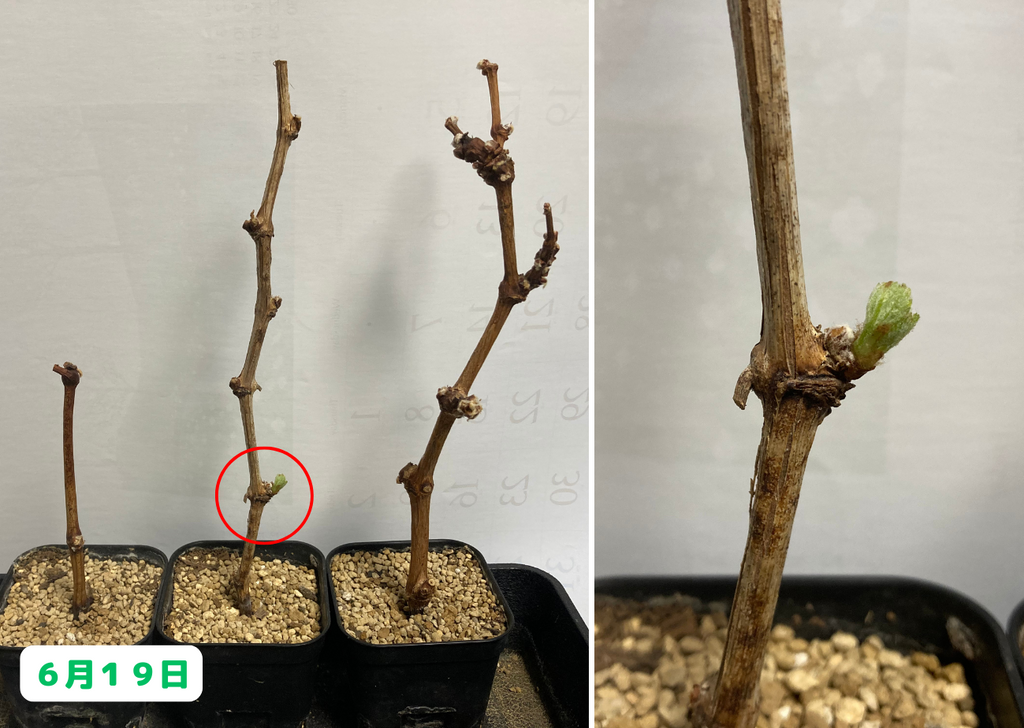 その翌日に、別の挿し木からも新芽が姿を現していました!・・・正直、もう新芽は出ないと思っていたので、水やりも止めて鉢植えから挿し木を抜こうかと思っていましたが、根気強くお世話を続けて良かったです(笑)。その後・・・