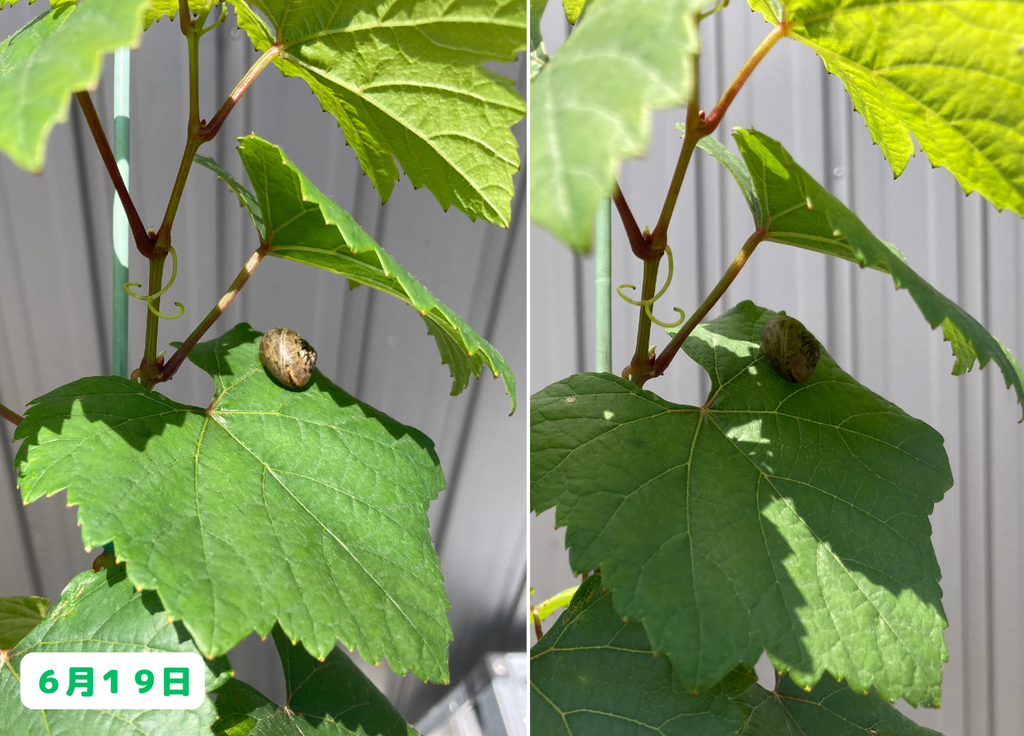 この日は、カタツムリを発見。今年も遊びに来てくれたようですが、私が鉢植えを動かしたせいで日向になってしまったので、すぐに日陰になるように置き直しました。さて、そんな先輩カベルネですが・・・