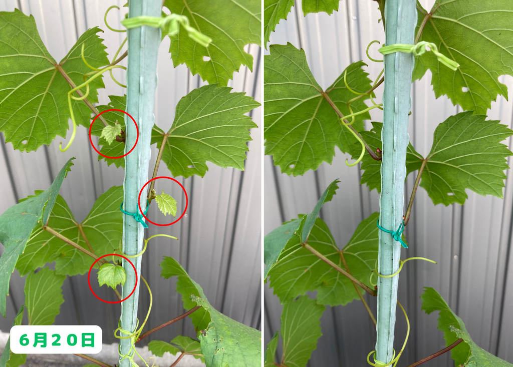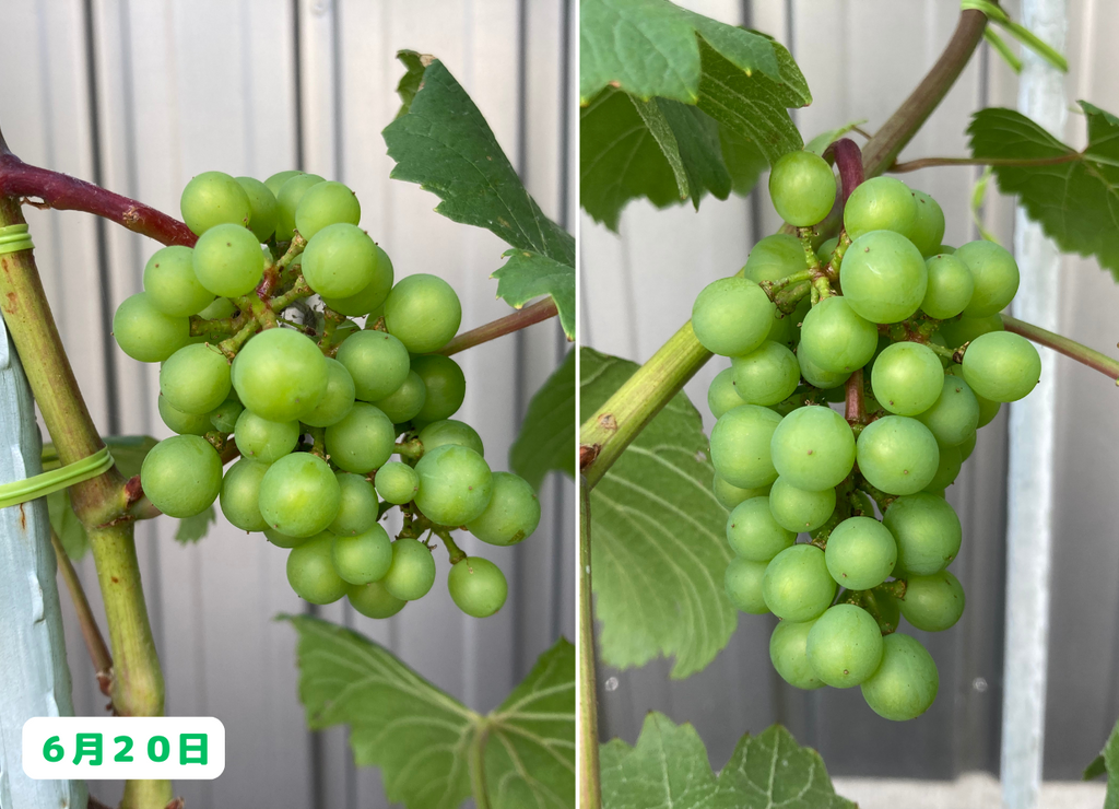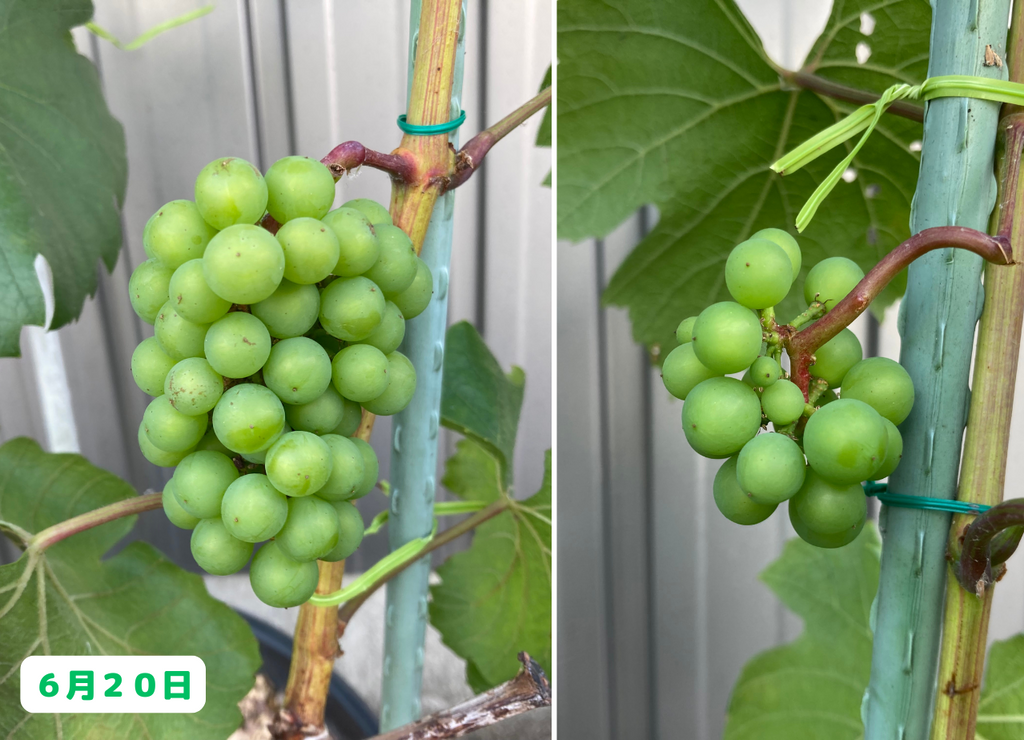みなさんこんにちは。園芸素人の私がブドウ栽培に挑戦すると言うこの企画、前回は小さい鉢植えのブドウ達の間引き剪定や支柱への誘引などを行いましたが、その後の様子はと言うと・・・